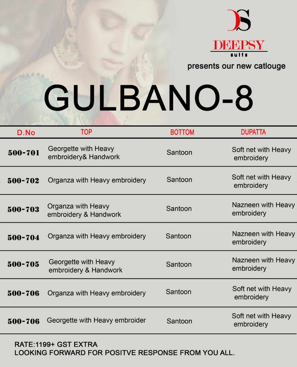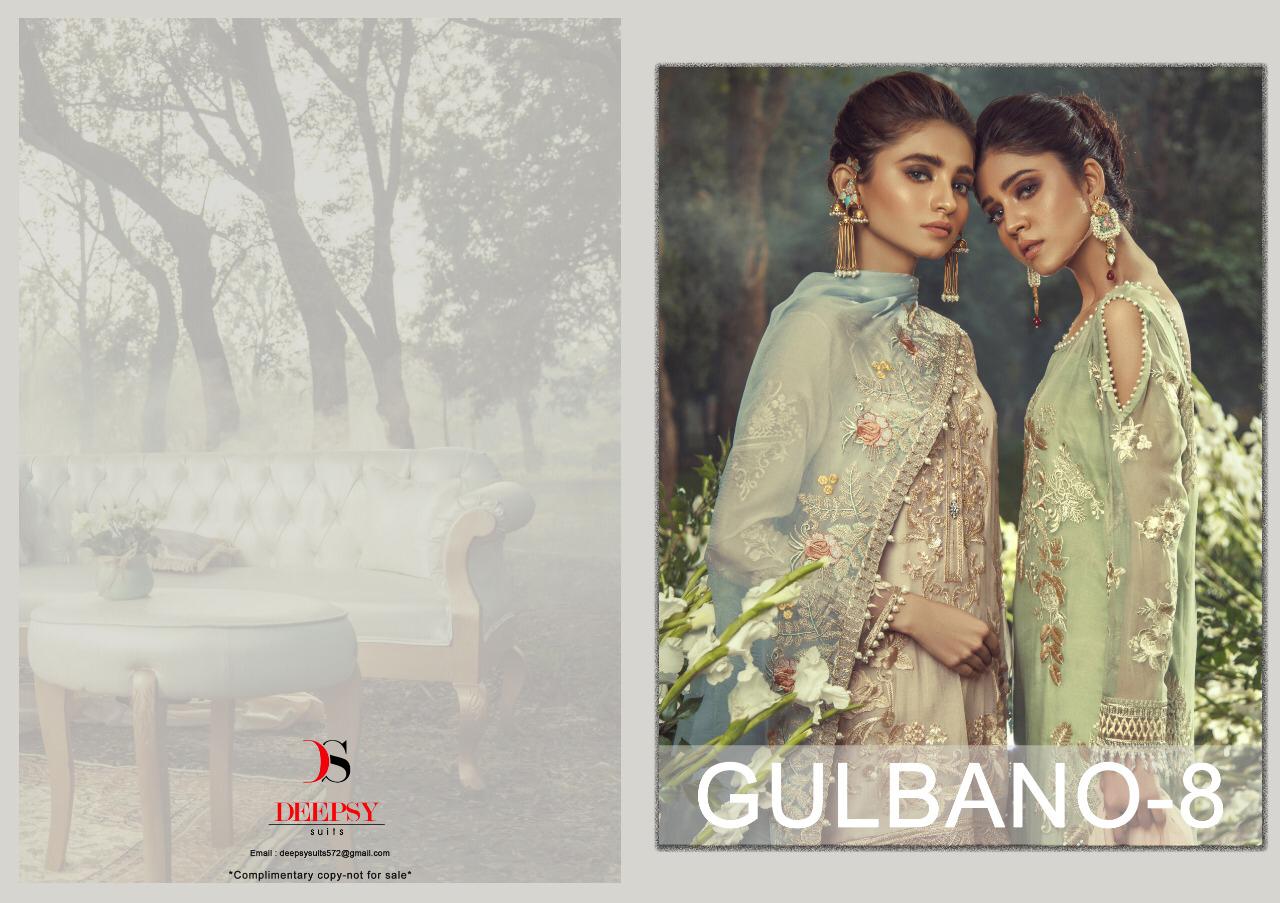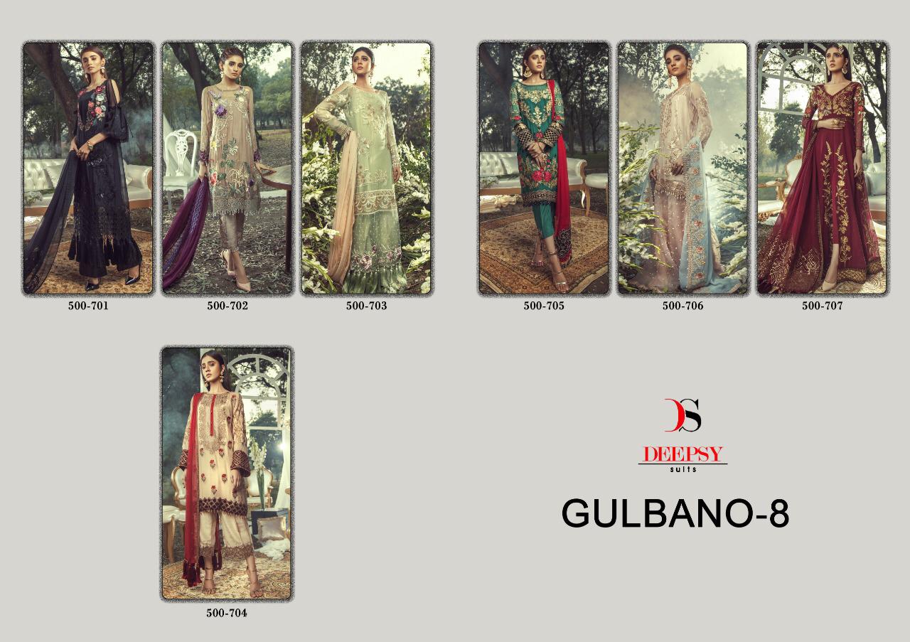 Buy Online Gulbano Vol 8 By Deepsy 500701 Series Fancy Party Wear Pakistani Salwar Kameez Catlog Wholesaler Surat 6 Pcs of Full Catalogue at Wholesale Price. Looking for Gulbano Vol 8 By Deepsy 500701 Series Fancy Party Wear Pakistani Salwar Kameez Catlog Wholesaler Surat Full Catalouge at Best Price? Buy Now Gulbano Vol 8 By Deepsy 500701 Series Fancy Party Wear Pakistani Salwar Kameez Catlog Wholesaler Surat at Wholesale Rate of Rs 7194 with Total 6 Pcs from authroized dealer and supplier of DEEPSY Brand. Cost of Each piece is just only Rs 1199 which is very low and affordable price to resale the product in your retail store ,This is Surat based Wholesale Supplier & Dealer of DEEPSY Brand. Click on Brand name to Know more about DEEPSY Brand's products.Call or Whatsapp on 9898838984 for booking or enquiry