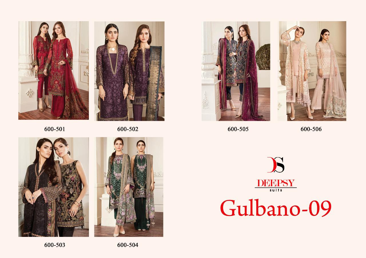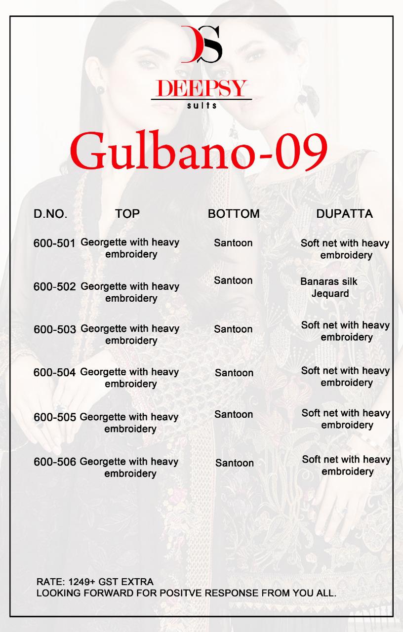 Buy Online Gulbano Vol 9 By Deepsy 600501 Series Georgette Pakistani Salwar Kameez Catlog Wholesaler Surat 6 Pcs of Full Catalogue at Wholesale Price. Looking for Gulbano Vol 9 By Deepsy 600501 Series Georgette Pakistani Salwar Kameez Catlog Wholesaler Surat Full Catalouge at Best Price? Buy Now Gulbano Vol 9 By Deepsy 600501 Series Georgette Pakistani Salwar Kameez Catlog Wholesaler Surat at Wholesale Rate of Rs 7494 with Total 6 Pcs from authroized dealer and supplier of DEEPSY Brand. Cost of Each piece is just only Rs 1249 which is very low and affordable price to resale the product in your retail store ,This is Surat based Wholesale Supplier & Dealer of DEEPSY Brand. Click on Brand name to Know more about DEEPSY Brand's products.Call or Whatsapp on 9898838984 for booking or enquiry