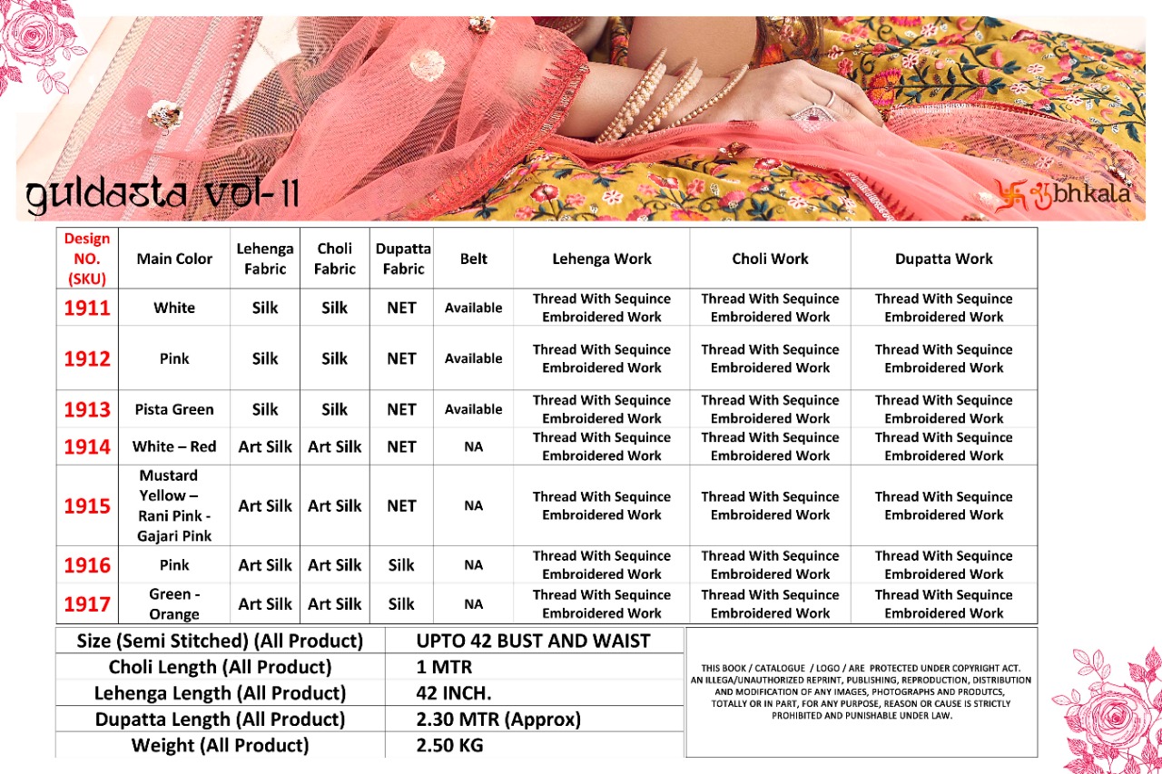 Buy Online Guldasta Vol 11 By Shubhkala Silk Lehanga Choli Single And Set Stockiest And Supplier From Surat 7 Pcs of Full Catalogue at Wholesale Price. Looking for Guldasta Vol 11 By Shubhkala Silk Lehanga Choli Single And Set Stockiest And Supplier From Surat Full Catalouge at Best Price? Buy Now Guldasta Vol 11 By Shubhkala Silk Lehanga Choli Single And Set Stockiest And Supplier From Surat at Wholesale Rate of Rs 42000 with Total 7 Pcs from authroized dealer and supplier of Brand. Cost of Each piece is just only Rs 6000 which is very low and affordable price to resale the product in your retail store ,This is Surat based Wholesale Supplier & Dealer of Brand. Click on Brand name to Know more about Brand's products.Call or Whatsapp on 9898838984 for booking or enquiry