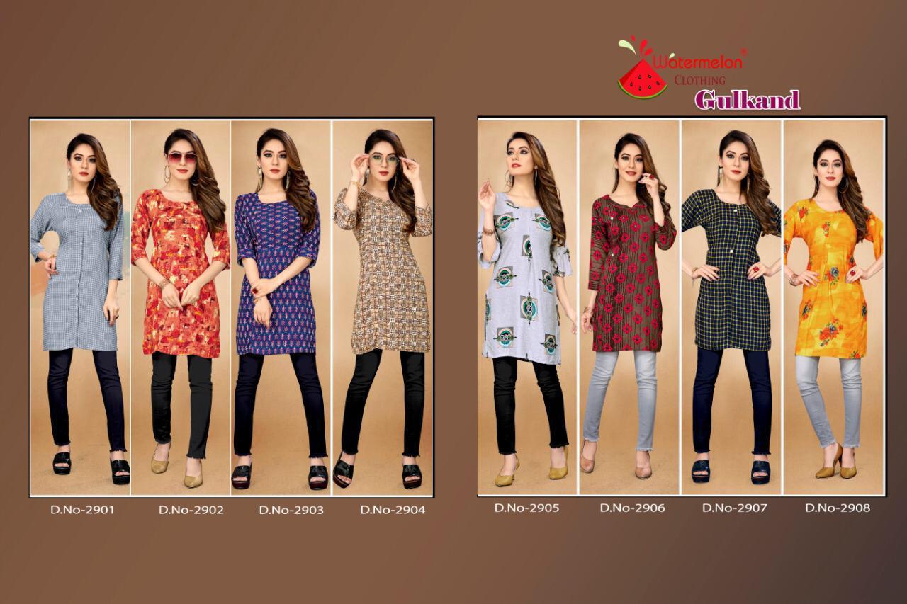 Buy Online Gulkand By Watermelon Reyon Printed Kurtis Wholesale Supplier And Dealer Surat 8 Pcs of Full Catalogue at Wholesale Price. Looking for Gulkand By Watermelon Reyon Printed Kurtis Wholesale Supplier And Dealer Surat Full Catalouge at Best Price? Buy Now Gulkand By Watermelon Reyon Printed Kurtis Wholesale Supplier And Dealer Surat at Wholesale Rate of Rs 2712 with Total 8 Pcs from authroized dealer and supplier of WATERMELON Brand. Cost of Each piece is just only Rs 339 which is very low and affordable price to resale the product in your retail store ,This is Surat based Wholesale Supplier & Dealer of WATERMELON Brand. Click on Brand name to Know more about WATERMELON Brand's products.Call or Whatsapp on 9898838984 for booking or enquiry