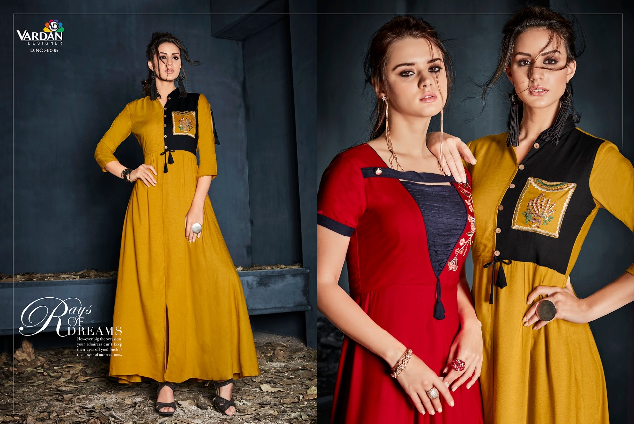 Gulnaz By Vardan Designer 6001 Series Fancy Reyon Long Kurti Catlog Wholesale Dealer And Supplier Surat