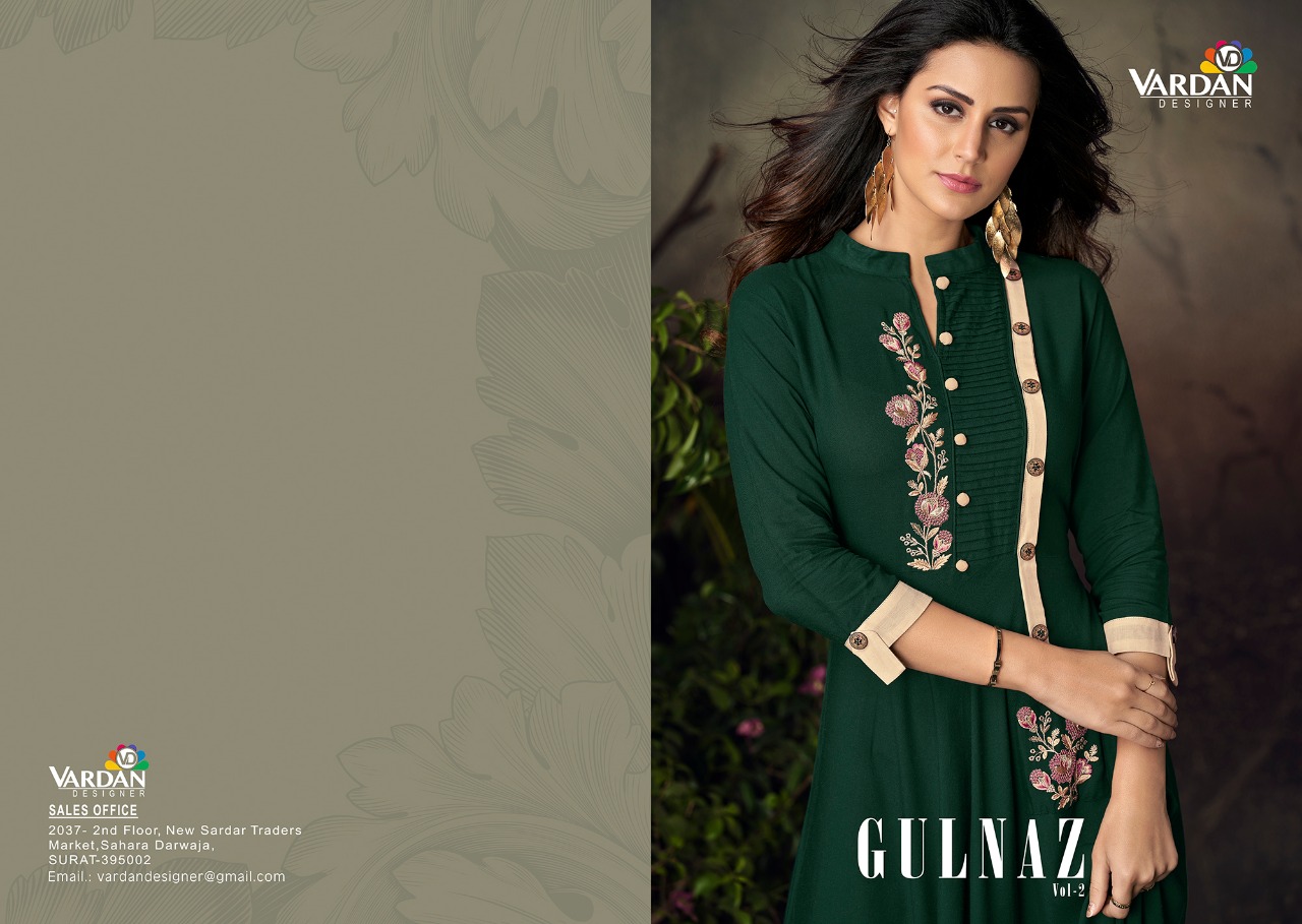 Buy Online Gulnaz Vol 2 By Vardan Designer Reyon Gown Collection Supplier India 8 Pcs of Full Catalogue at Wholesale Price. Looking for Gulnaz Vol 2 By Vardan Designer Reyon Gown Collection Supplier India Full Catalouge at Best Price? Buy Now Gulnaz Vol 2 By Vardan Designer Reyon Gown Collection Supplier India at Wholesale Rate of Rs 6360 with Total 8 Pcs from authroized dealer and supplier of VARDAN DESIGNER Brand. Cost of Each piece is just only Rs 795 which is very low and affordable price to resale the product in your retail store ,This is Surat based Wholesale Supplier & Dealer of VARDAN DESIGNER Brand. Click on Brand name to Know more about VARDAN DESIGNER Brand's products.Call or Whatsapp on 9898838984 for booking or enquiry