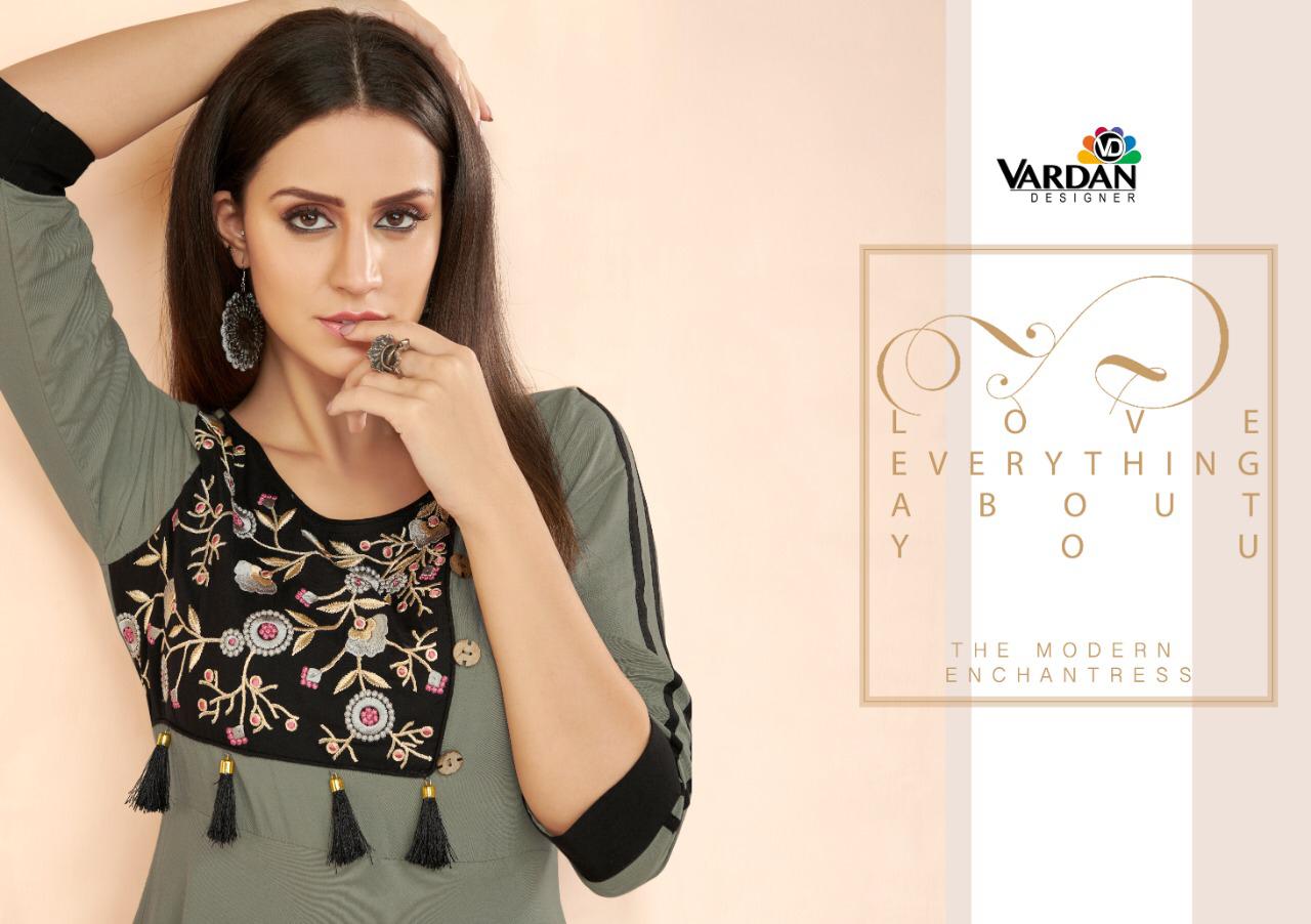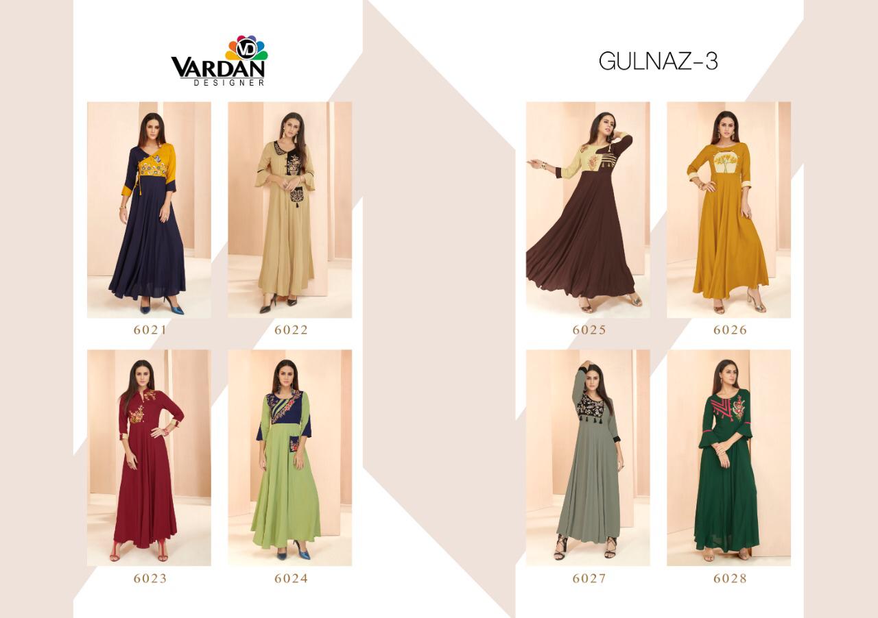 Buy Online Gulnaz Vol 3 By Vardan Designer Reyon Kurtis Wholesale Supplier And Dealer Surat 8 Pcs of Full Catalogue at Wholesale Price. Looking for Gulnaz Vol 3 By Vardan Designer Reyon Kurtis Wholesale Supplier And Dealer Surat Full Catalouge at Best Price? Buy Now Gulnaz Vol 3 By Vardan Designer Reyon Kurtis Wholesale Supplier And Dealer Surat at Wholesale Rate of Rs 6360 with Total 8 Pcs from authroized dealer and supplier of VARDAN DESIGNER Brand. Cost of Each piece is just only Rs 795 which is very low and affordable price to resale the product in your retail store ,This is Surat based Wholesale Supplier & Dealer of VARDAN DESIGNER Brand. Click on Brand name to Know more about VARDAN DESIGNER Brand's products.Call or Whatsapp on 9898838984 for booking or enquiry