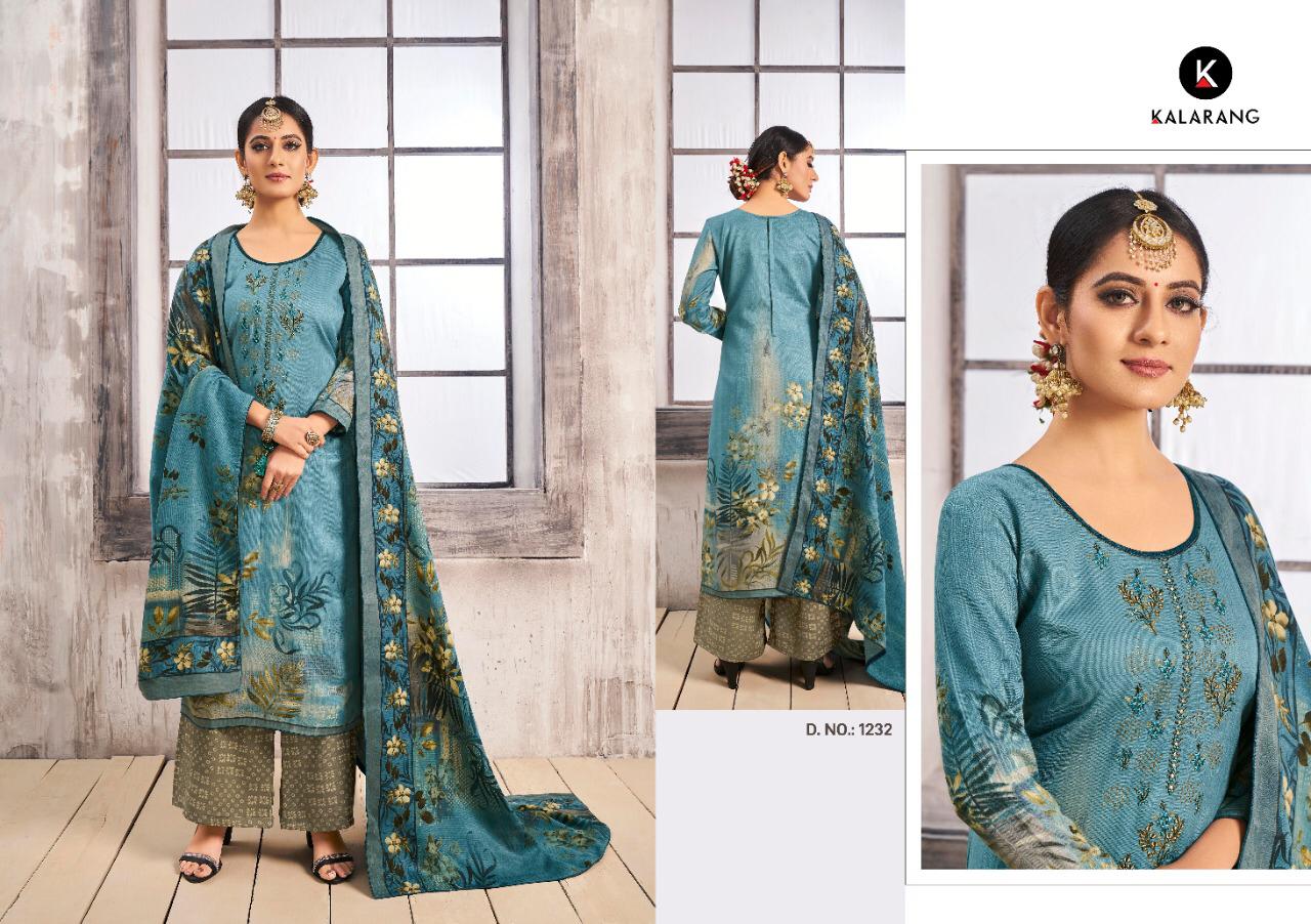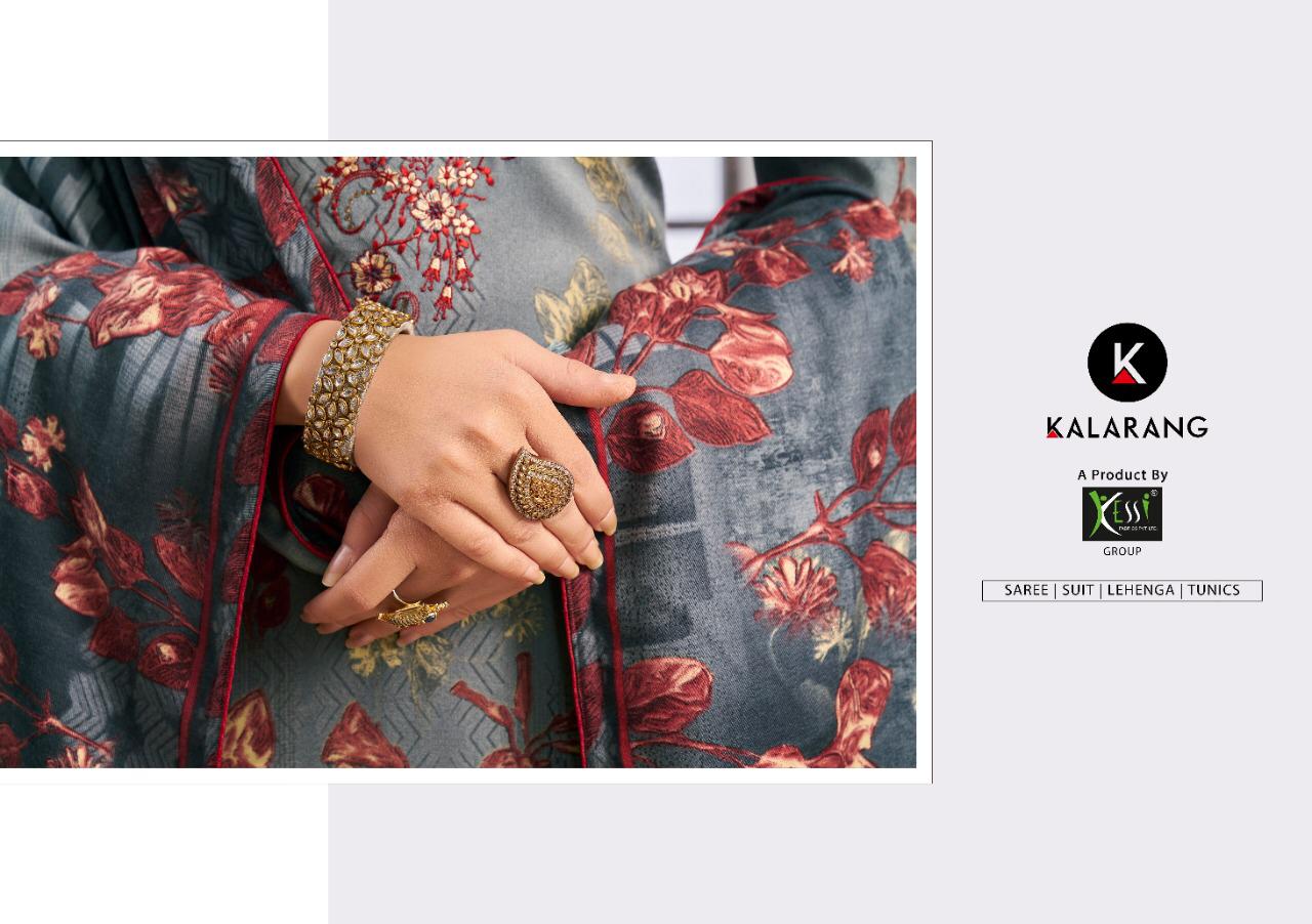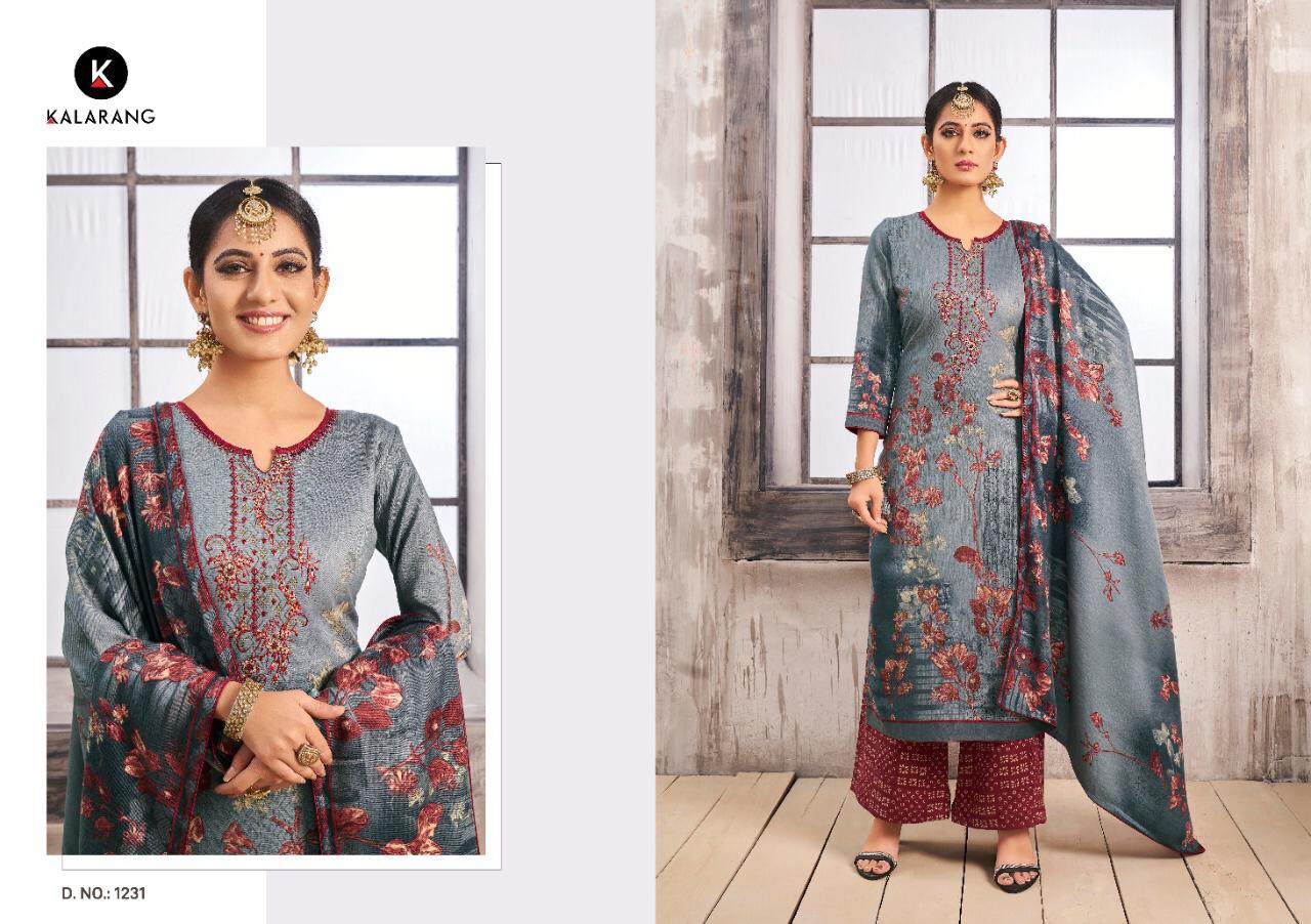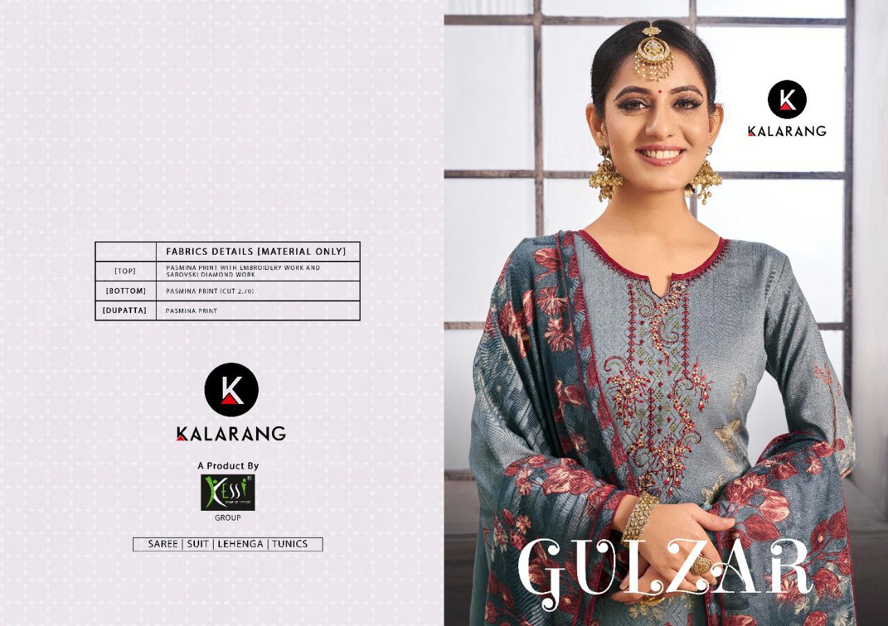Buy Online Gulzar By Kalarang Pashmina Designer Suits Wholesale Supplier Gujarat 4 Pcs of Full Catalogue at Wholesale Price. Looking for Gulzar By Kalarang Pashmina Designer Suits Wholesale Supplier Gujarat Full Catalouge at Best Price? Buy Now Gulzar By Kalarang Pashmina Designer Suits Wholesale Supplier Gujarat at Wholesale Rate of Rs 2996 with Total 4 Pcs from authroized dealer and supplier of KALARANG Brand. Cost of Each piece is just only Rs 749 which is very low and affordable price to resale the product in your retail store ,This is Surat based Wholesale Supplier & Dealer of KALARANG Brand. Click on Brand name to Know more about KALARANG Brand's products.Call or Whatsapp on 9898838984 for booking or enquiry