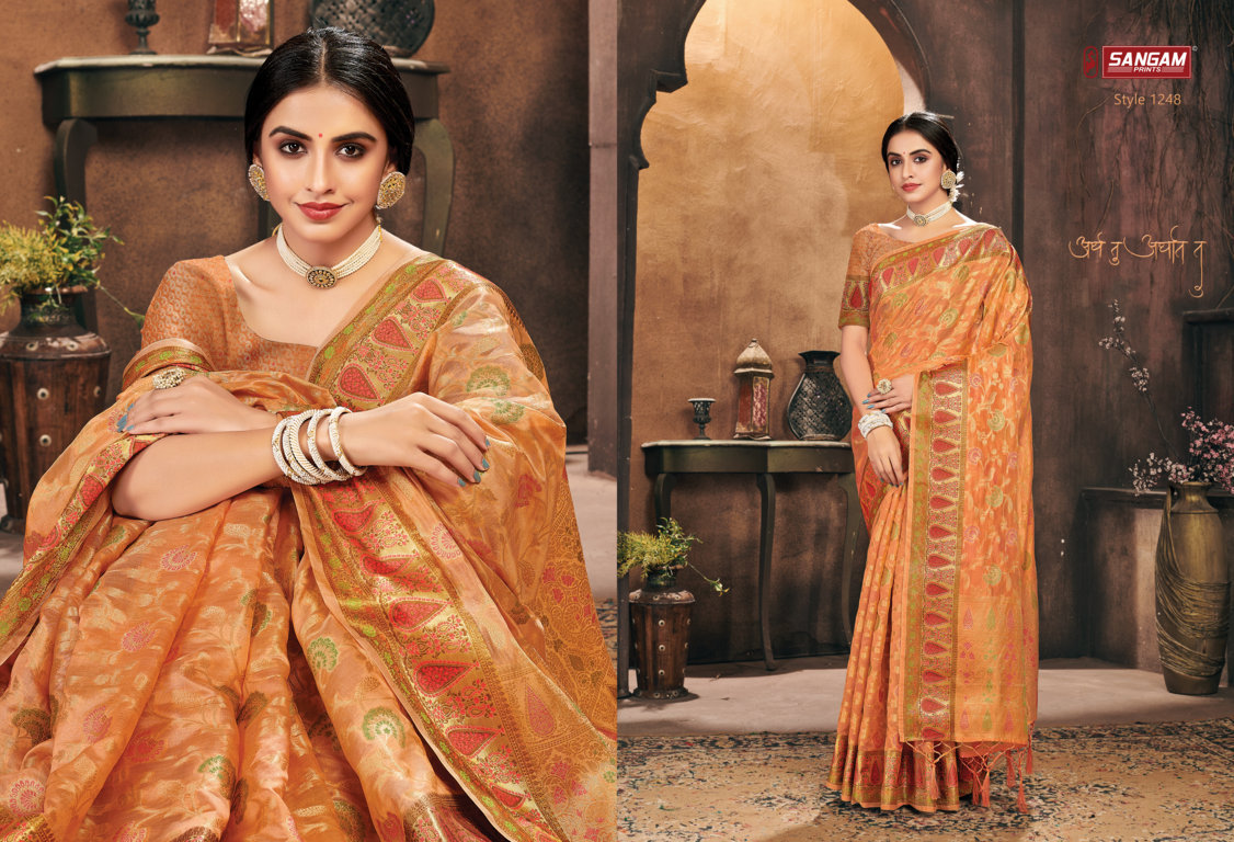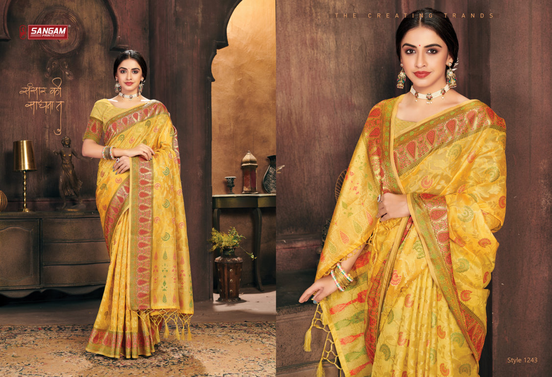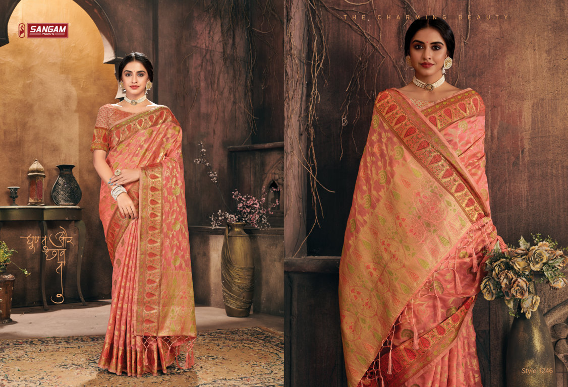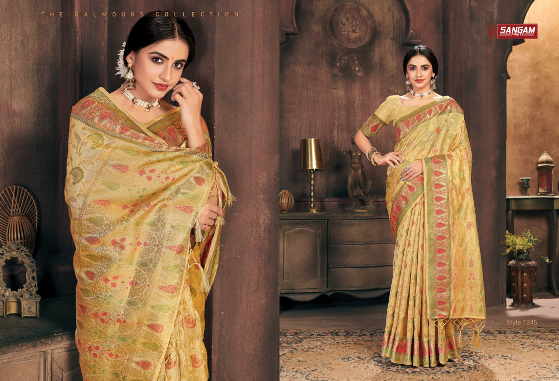 *_New Catalog Launching_* Catalog Name: *_Gulzar_* Brand: *_Sangam Prints_* Product Type: Saree Fabric: Organza Price Per Piece: 1325/- Gst Extra: 5% Work: Weaving Other Specifications: Rich Pallu Weaving Saree Mtr: 5.5 Mtr Blouse: 0.8 Mtr Total Pcs: 6 *_Book your orders now_* |