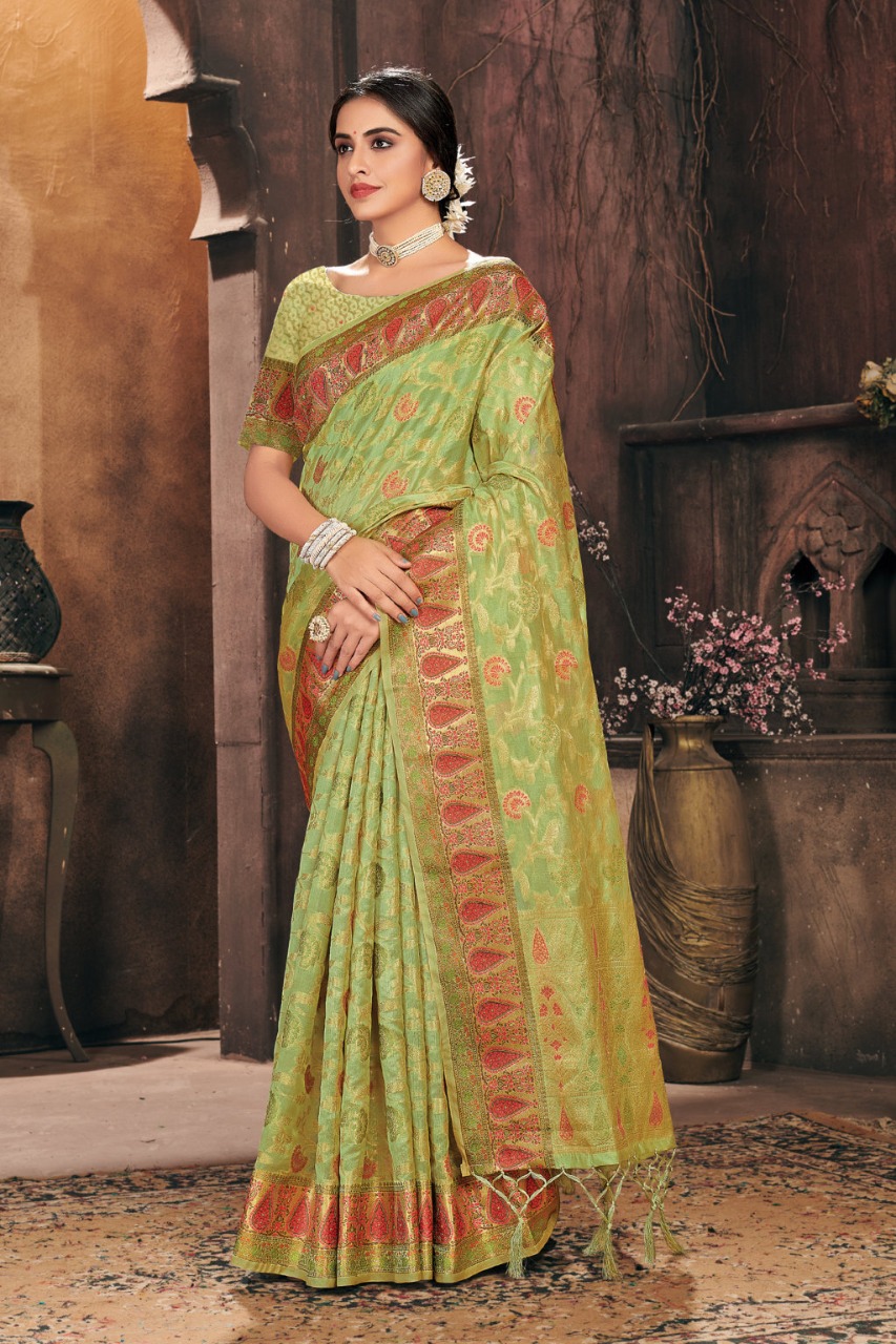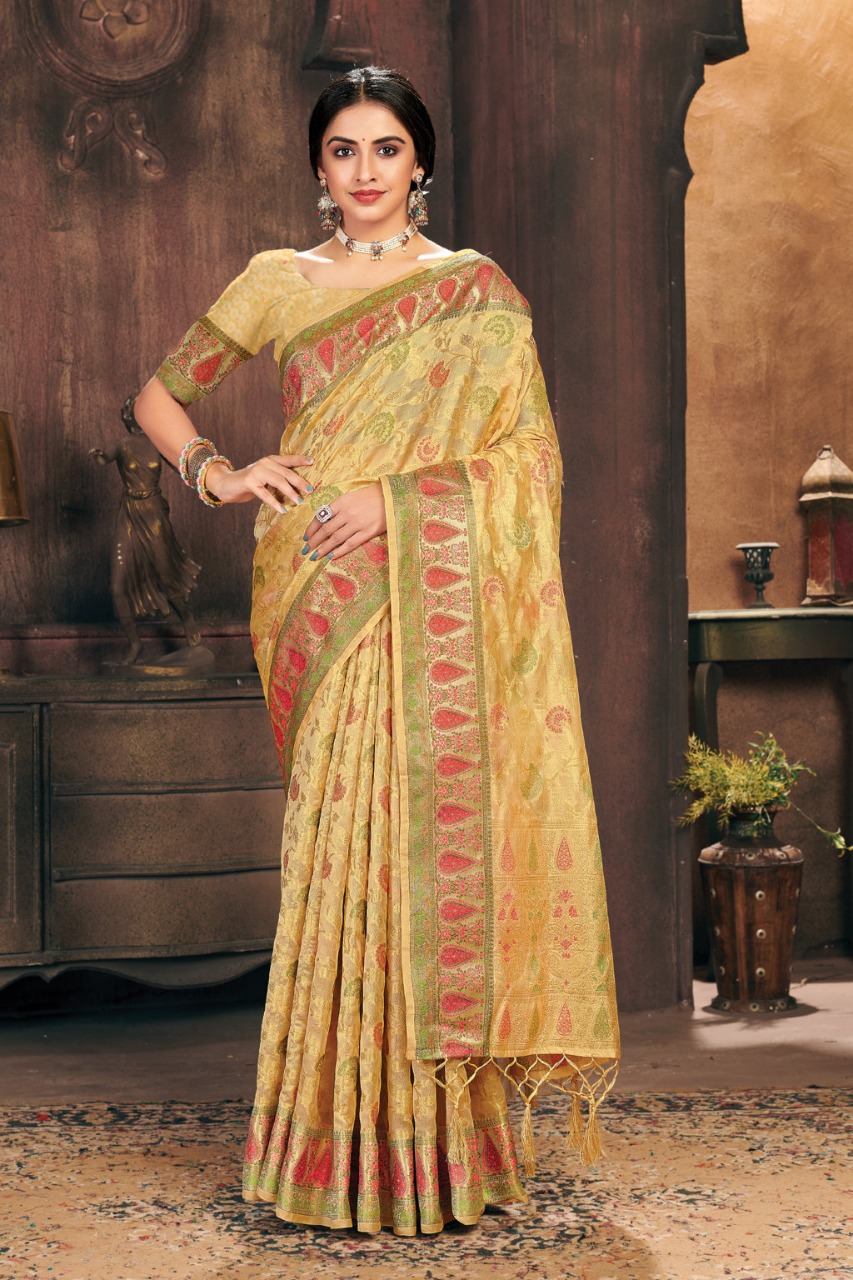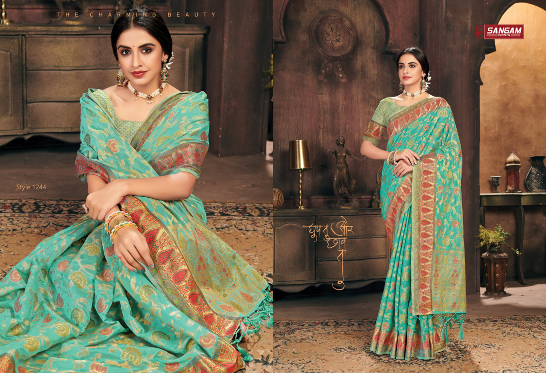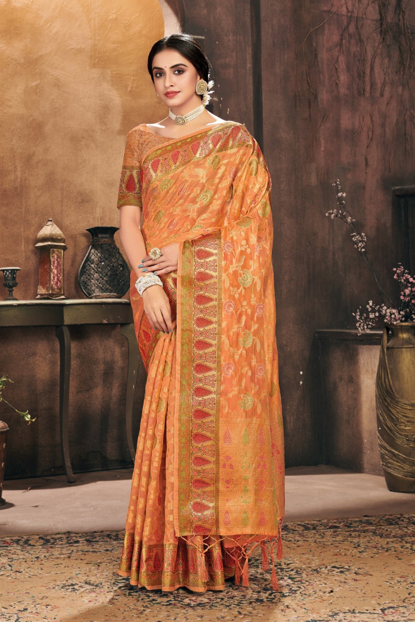 *_New Catalog Launching_* Catalog Name: *_Gulzar_* Brand: *_Sangam Prints_* Product Type: Saree Fabric: Organza Price Per Piece: 1325/- Gst Extra: 5% Work: Weaving Other Specifications: Rich Pallu Weaving Saree Mtr: 5.5 Mtr Blouse: 0.8 Mtr Total Pcs: 6 *_Book your orders now_* |