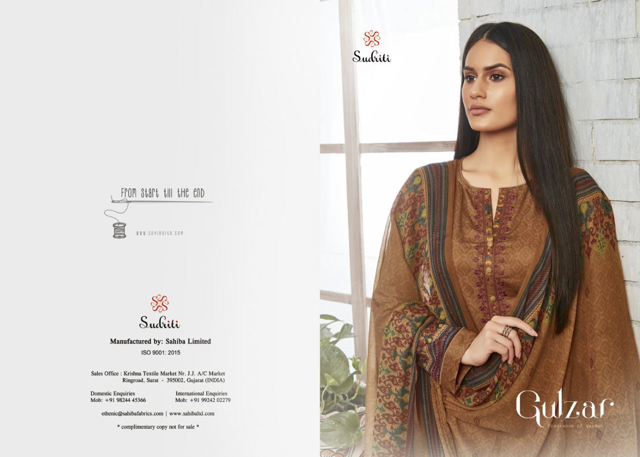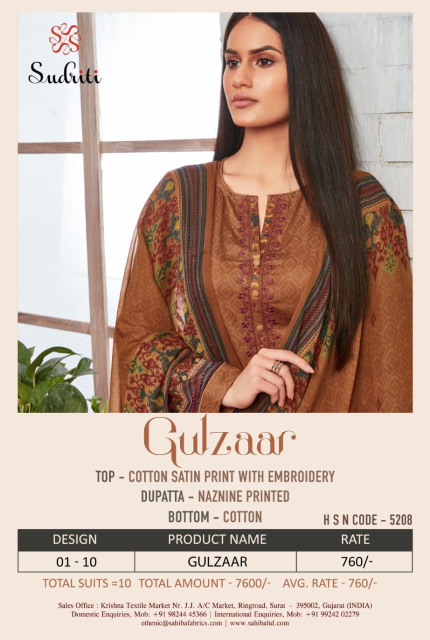 Buy Online Gulzar Sudriti A Sahiba Cotton Printed Embroidered Work Suits Wholesale Supplier And Dealer Surat 10 Pcs of Full Catalogue at Wholesale Price. Looking for Gulzar Sudriti A Sahiba Cotton Printed Embroidered Work Suits Wholesale Supplier And Dealer Surat Full Catalouge at Best Price? Buy Now Gulzar Sudriti A Sahiba Cotton Printed Embroidered Work Suits Wholesale Supplier And Dealer Surat at Wholesale Rate of Rs 7600 with Total 10 Pcs from authroized dealer and supplier of SAHIBA Brand. Cost of Each piece is just only Rs 760 which is very low and affordable price to resale the product in your retail store ,This is Surat based Wholesale Supplier & Dealer of SAHIBA Brand. Click on Brand name to Know more about SAHIBA Brand's products.Call or Whatsapp on 9898838984 for booking or enquiry