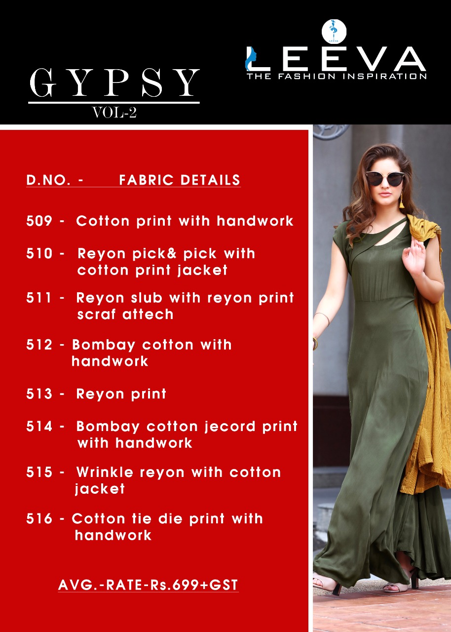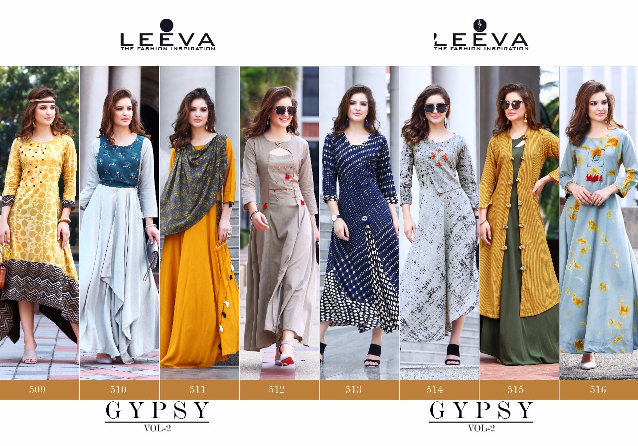 Buy Online Gypsy Vol 2 By Leeva 509 Series Designer Kurti Catlog Wholesale Dealer And Supplier Surat 8 Pcs of Full Catalogue at Wholesale Price. Looking for Gypsy Vol 2 By Leeva 509 Series Designer Kurti Catlog Wholesale Dealer And Supplier Surat Full Catalouge at Best Price? Buy Now Gypsy Vol 2 By Leeva 509 Series Designer Kurti Catlog Wholesale Dealer And Supplier Surat at Wholesale Rate of Rs 5592 with Total 8 Pcs from authroized dealer and supplier of LEEVA Brand. Cost of Each piece is just only Rs 699 which is very low and affordable price to resale the product in your retail store ,This is Surat based Wholesale Supplier & Dealer of LEEVA Brand. Click on Brand name to Know more about LEEVA Brand's products.Call or Whatsapp on 9898838984 for booking or enquiry