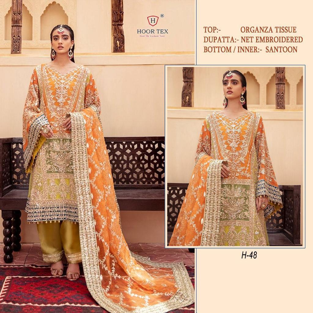 Buy Online H 48 By Hoor Tex Organza Pakistani Suits 5 Pcs of Full Catalogue at Wholesale Price. Looking for H 48 By Hoor Tex Organza Pakistani Suits Full Catalouge at Best Price? Buy Now H 48 By Hoor Tex Organza Pakistani Suits at Wholesale Rate of Rs 4750 with Total 5 Pcs from authroized dealer and supplier of Brand. Cost of Each piece is just only Rs 950 which is very low and affordable price to resale the product in your retail store ,This is Surat based Wholesale Supplier & Dealer of Brand. Click on Brand name to Know more about Brand's products.Call or Whatsapp on 9898838984 for booking or enquiry