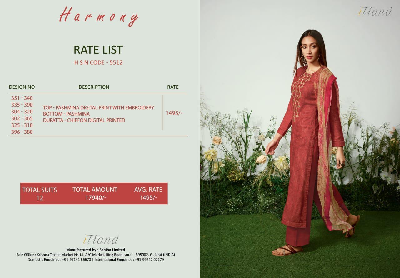 Buy Online Harmony By Itrana Pashmina Dress Materials Wholesale Supplier Surat 12 Pcs of Full Catalogue at Wholesale Price. Looking for Harmony By Itrana Pashmina Dress Materials Wholesale Supplier Surat Full Catalouge at Best Price? Buy Now Harmony By Itrana Pashmina Dress Materials Wholesale Supplier Surat at Wholesale Rate of Rs 17940 with Total 12 Pcs from authroized dealer and supplier of ITRANA Brand. Cost of Each piece is just only Rs 1495 which is very low and affordable price to resale the product in your retail store ,This is Surat based Wholesale Supplier & Dealer of ITRANA Brand. Click on Brand name to Know more about ITRANA Brand's products.Call or Whatsapp on 9898838984 for booking or enquiry