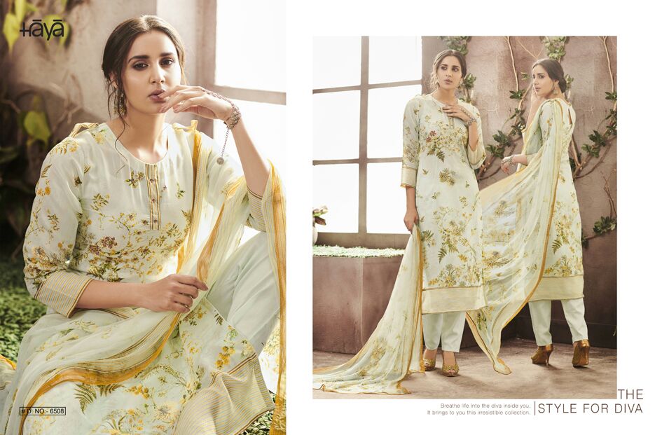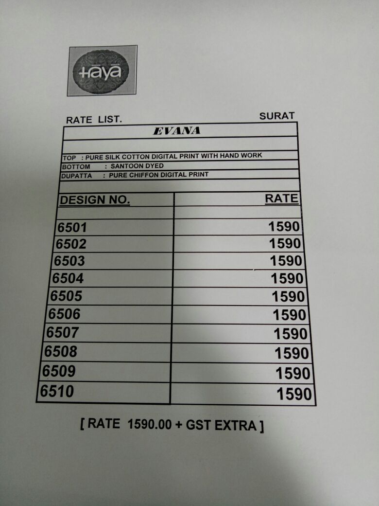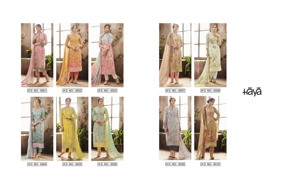 Buy Online Haya Enana 6501 Series Fancy Silk Cotton Print Salwar Suit 10 Pcs of Full Catalogue at Wholesale Price. Looking for Haya Enana 6501 Series Fancy Silk Cotton Print Salwar Suit Full Catalouge at Best Price? Buy Now Haya Enana 6501 Series Fancy Silk Cotton Print Salwar Suit at Wholesale Rate of Rs 15900 with Total 10 Pcs from authroized dealer and supplier of HAYA Brand. Cost of Each piece is just only Rs 1590 which is very low and affordable price to resale the product in your retail store ,This is Surat based Wholesale Supplier & Dealer of HAYA Brand. Click on Brand name to Know more about HAYA Brand's products.Call or Whatsapp on 9898838984 for booking or enquiry