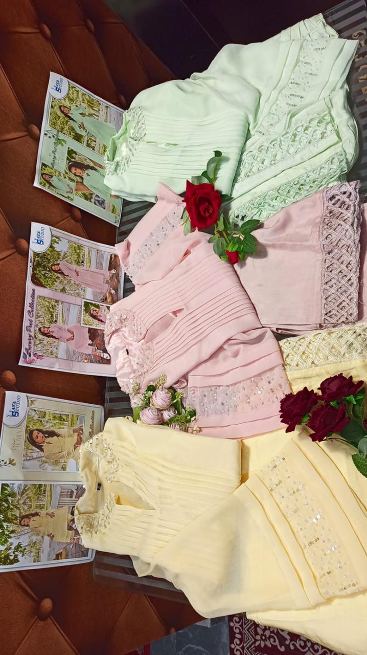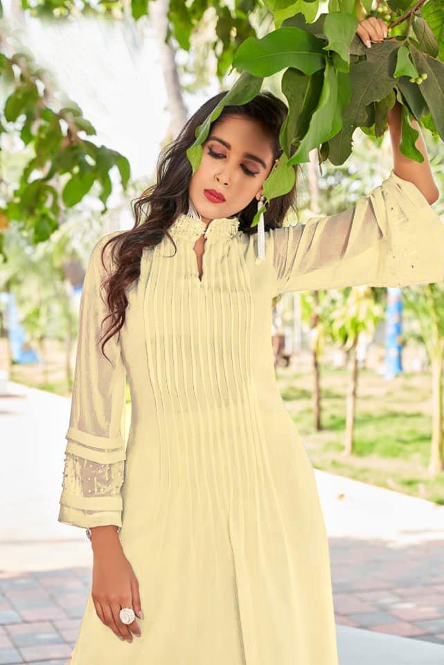 ?? * Calm vibrant Collection *?? ????????? *Haya Studio* (D.no:-1006) ???????? ? *Description*? ??????? *Designer Tunic * with Delicate Handwork n pleating pattern.....paired with *Designer cut work embroidery palazzo* ? *Details*? ??????? ? * Top*:- Pure self lining georgette *Inner :- Santoon ? *Bottom * :- pure santoon ? *Colour* Lemon yellow Light Dusty pink Mint green ?? *Size Chart *?? ? *Top xl size chest* (42) ? *Bottom xl size* (34-38) *Full Set Available* ?*Rate:-999/- 5% Gst set to set Single 1099+5% ?Colour may slightly vary due to light effect? *Dispatch Ready* *Limited stock* |