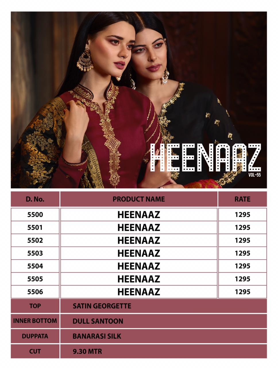 Buy Online Heenaaz Vol 55 Fancy Party Wear Satin Georgette Salwar Kameez Catlog Wholesaler Surat 6 Pcs of Full Catalogue at Wholesale Price. Looking for Heenaaz Vol 55 Fancy Party Wear Satin Georgette Salwar Kameez Catlog Wholesaler Surat Full Catalouge at Best Price? Buy Now Heenaaz Vol 55 Fancy Party Wear Satin Georgette Salwar Kameez Catlog Wholesaler Surat at Wholesale Rate of Rs 7770 with Total 6 Pcs from authroized dealer and supplier of Brand. Cost of Each piece is just only Rs 1295 which is very low and affordable price to resale the product in your retail store ,This is Surat based Wholesale Supplier & Dealer of Brand. Click on Brand name to Know more about Brand's products.Call or Whatsapp on 9898838984 for booking or enquiry