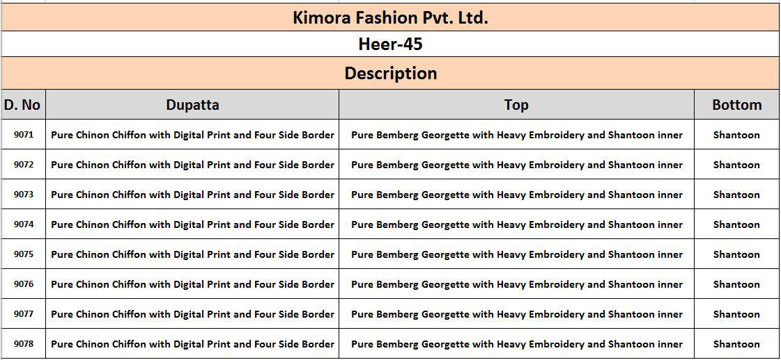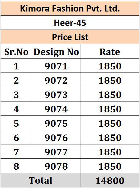 Heer -45 by Kimora . Series -9071 to 9078. Set To Set. GST 5 Percent Extra. Delivery date -01-05-19. Book your order now |