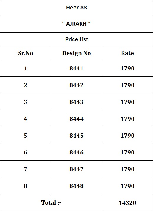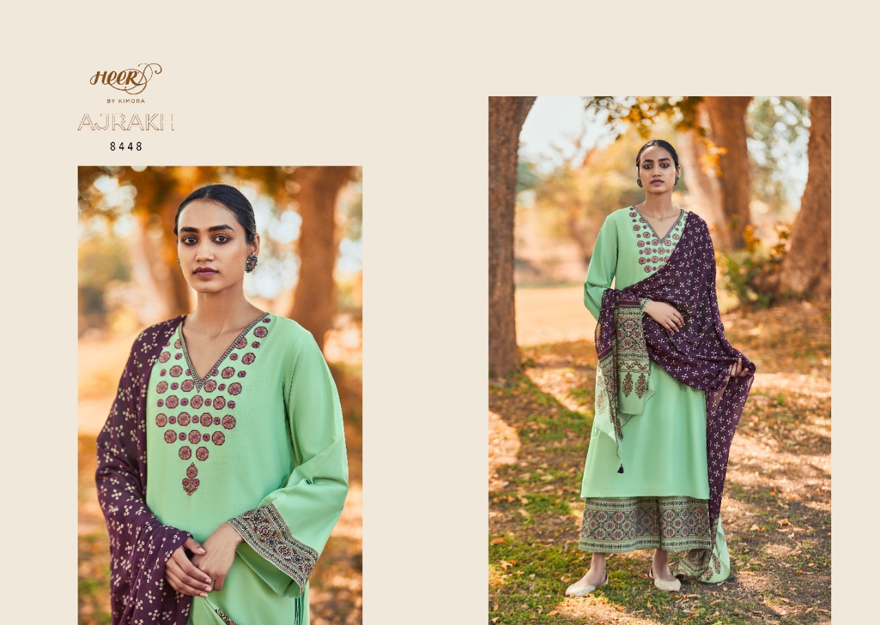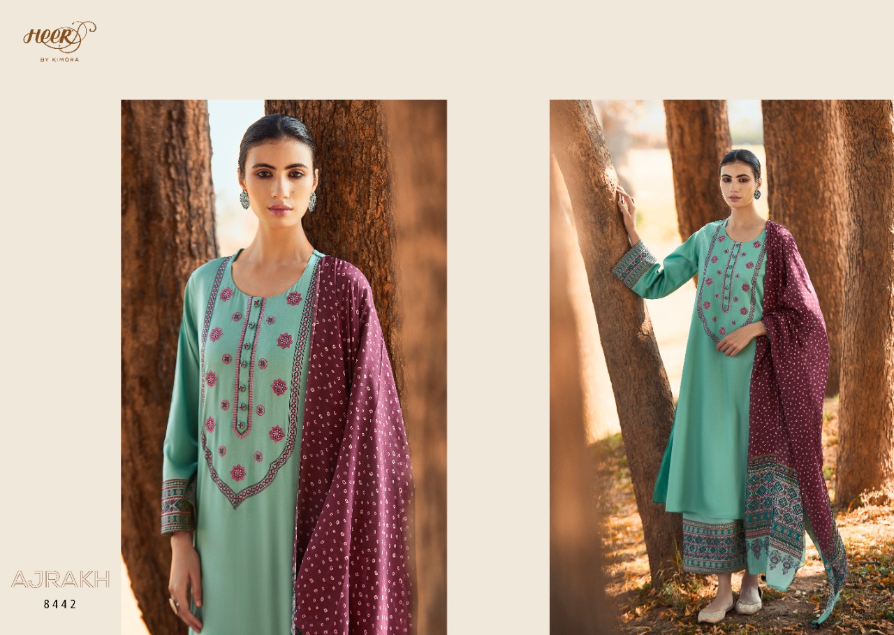 Buy Online Heer 88 By Kimora Ajrakh Collection 8441 To 8448 Wholesale Supplier Single And Full Set Stockiest 8 Pcs of Full Catalogue at Wholesale Price. Looking for Heer 88 By Kimora Ajrakh Collection 8441 To 8448 Wholesale Supplier Single And Full Set Stockiest Full Catalouge at Best Price? Buy Now Heer 88 By Kimora Ajrakh Collection 8441 To 8448 Wholesale Supplier Single And Full Set Stockiest at Wholesale Rate of Rs 14320 with Total 8 Pcs from authroized dealer and supplier of KIMORA Brand. Cost of Each piece is just only Rs 1790 which is very low and affordable price to resale the product in your retail store ,This is Surat based Wholesale Supplier & Dealer of KIMORA Brand. Click on Brand name to Know more about KIMORA Brand's products.Call or Whatsapp on 9898838984 for booking or enquiry