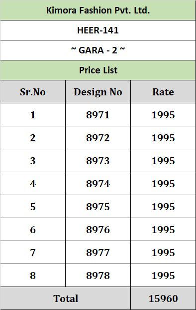 Buy Online Heer New Gara Vol 2 Designer Collection 8 Pcs of Full Catalogue at Wholesale Price. Looking for Heer New Gara Vol 2 Designer Collection Full Catalouge at Best Price? Buy Now Heer New Gara Vol 2 Designer Collection at Wholesale Rate of Rs 15960 with Total 8 Pcs from authroized dealer and supplier of Brand. Cost of Each piece is just only Rs 1995 which is very low and affordable price to resale the product in your retail store ,This is Surat based Wholesale Supplier & Dealer of Brand. Click on Brand name to Know more about Brand's products.Call or Whatsapp on 9898838984 for booking or enquiry