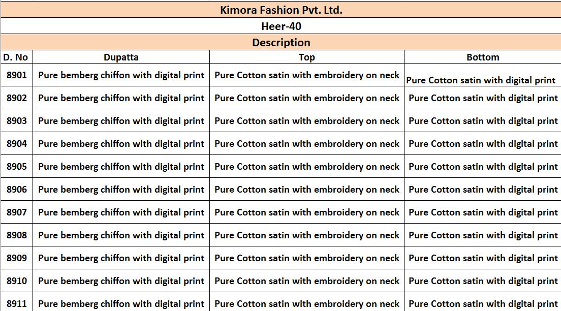 Buy Online Heer Vol 40 By Kimora Fashion Wholesale From Surat Pure Suits 11 Pcs of Full Catalogue at Wholesale Price. Looking for Heer Vol 40 By Kimora Fashion Wholesale From Surat Pure Suits Full Catalouge at Best Price? Buy Now Heer Vol 40 By Kimora Fashion Wholesale From Surat Pure Suits at Wholesale Rate of Rs 18590 with Total 11 Pcs from authroized dealer and supplier of KIMORA Brand. Cost of Each piece is just only Rs 1690 which is very low and affordable price to resale the product in your retail store ,This is Surat based Wholesale Supplier & Dealer of KIMORA Brand. Click on Brand name to Know more about KIMORA Brand's products.Call or Whatsapp on 9898838984 for booking or enquiry