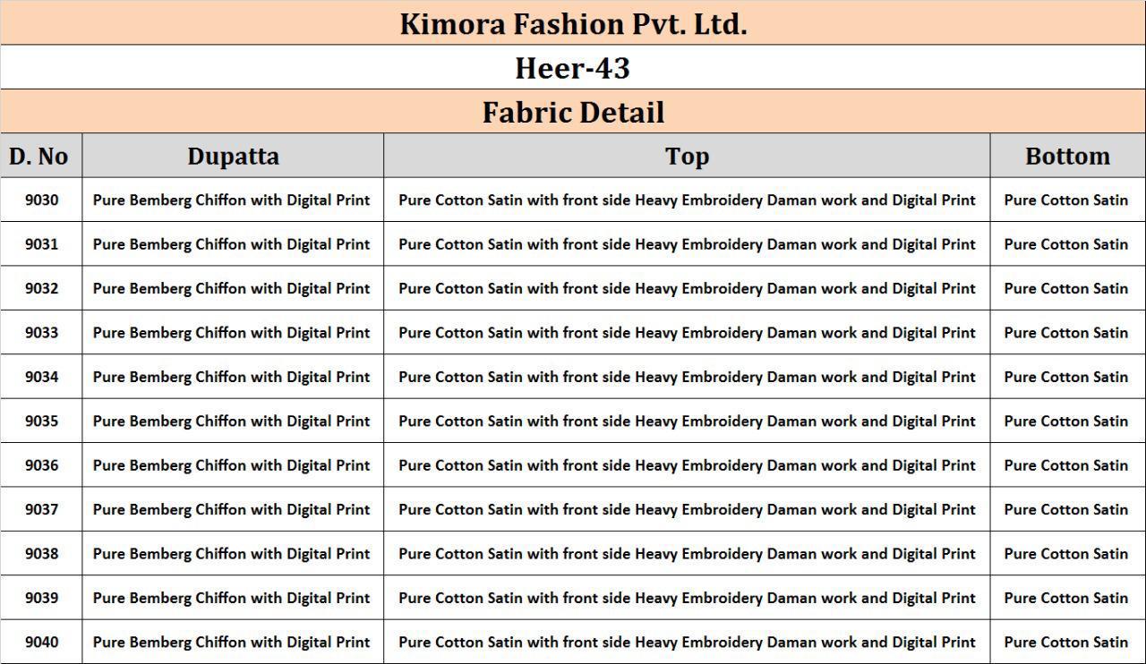 Buy Online Heer Vol 43 By Kimora 9031 Series Fancy Cotton Satin Printed Salwar Kameez Catlog Wholesaler Surat 11 Pcs of Full Catalogue at Wholesale Price. Looking for Heer Vol 43 By Kimora 9031 Series Fancy Cotton Satin Printed Salwar Kameez Catlog Wholesaler Surat Full Catalouge at Best Price? Buy Now Heer Vol 43 By Kimora 9031 Series Fancy Cotton Satin Printed Salwar Kameez Catlog Wholesaler Surat at Wholesale Rate of Rs 18425 with Total 11 Pcs from authroized dealer and supplier of KIMORA Brand. Cost of Each piece is just only Rs 1675 which is very low and affordable price to resale the product in your retail store ,This is Surat based Wholesale Supplier & Dealer of KIMORA Brand. Click on Brand name to Know more about KIMORA Brand's products.Call or Whatsapp on 9898838984 for booking or enquiry