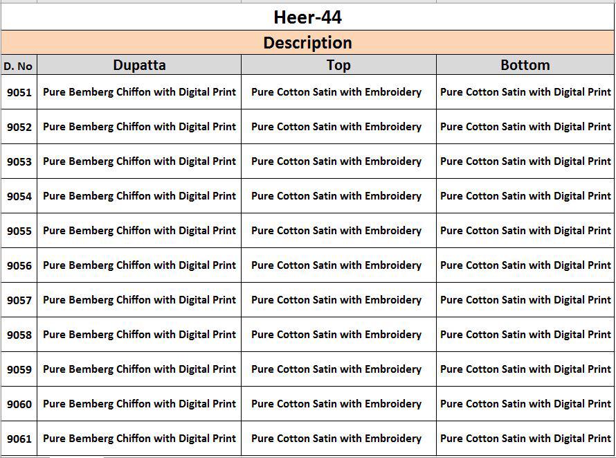 Buy Online Heer Vol 44 By Kimora 9051 Series Fancy Party Wear Pure Cotton Satin Salwar Kameez Catlog Wholesaler Surat 11 Pcs of Full Catalogue at Wholesale Price. Looking for Heer Vol 44 By Kimora 9051 Series Fancy Party Wear Pure Cotton Satin Salwar Kameez Catlog Wholesaler Surat Full Catalouge at Best Price? Buy Now Heer Vol 44 By Kimora 9051 Series Fancy Party Wear Pure Cotton Satin Salwar Kameez Catlog Wholesaler Surat at Wholesale Rate of Rs 18150 with Total 11 Pcs from authroized dealer and supplier of KIMORA Brand. Cost of Each piece is just only Rs 1650 which is very low and affordable price to resale the product in your retail store ,This is Surat based Wholesale Supplier & Dealer of KIMORA Brand. Click on Brand name to Know more about KIMORA Brand's products.Call or Whatsapp on 9898838984 for booking or enquiry