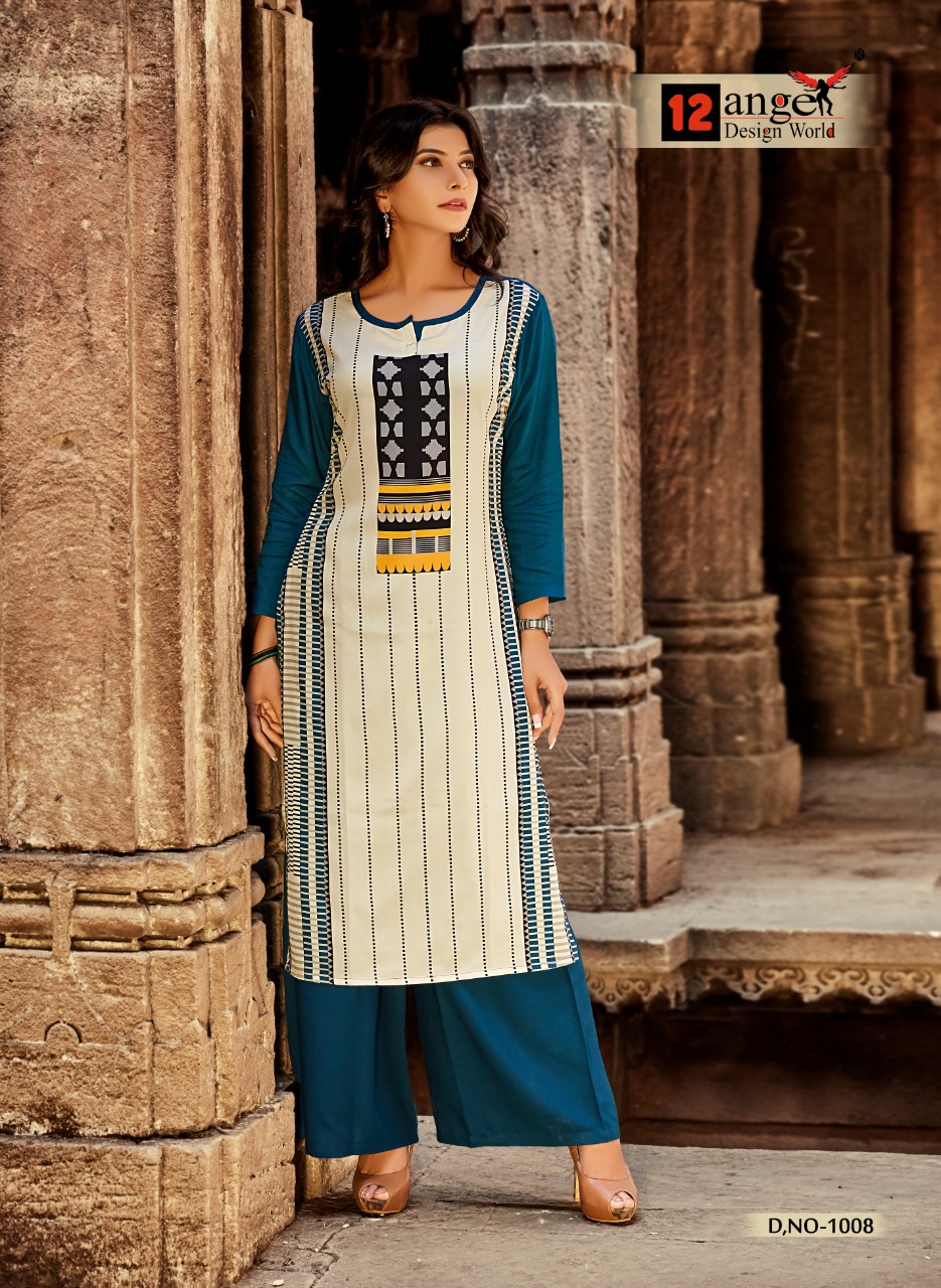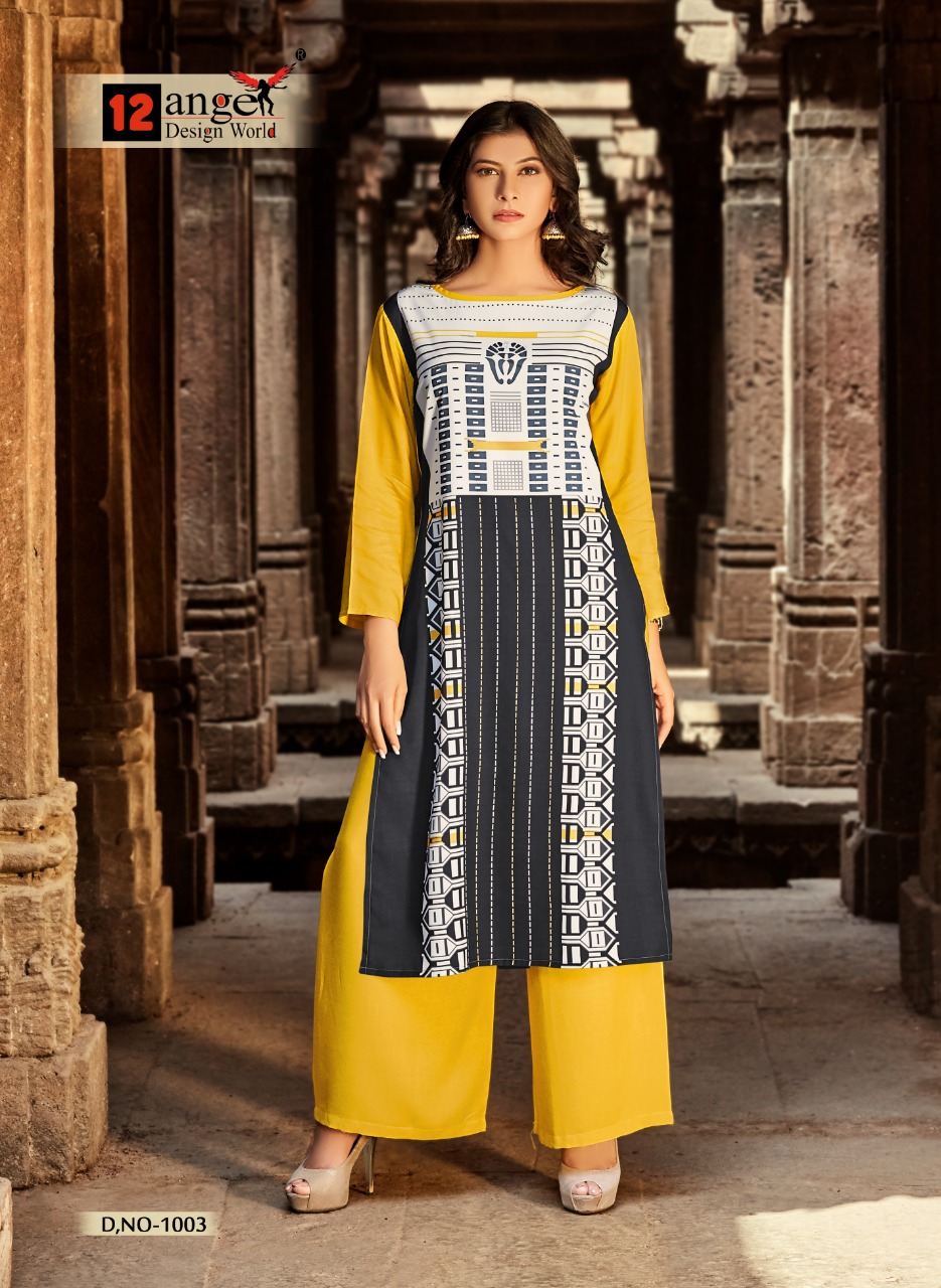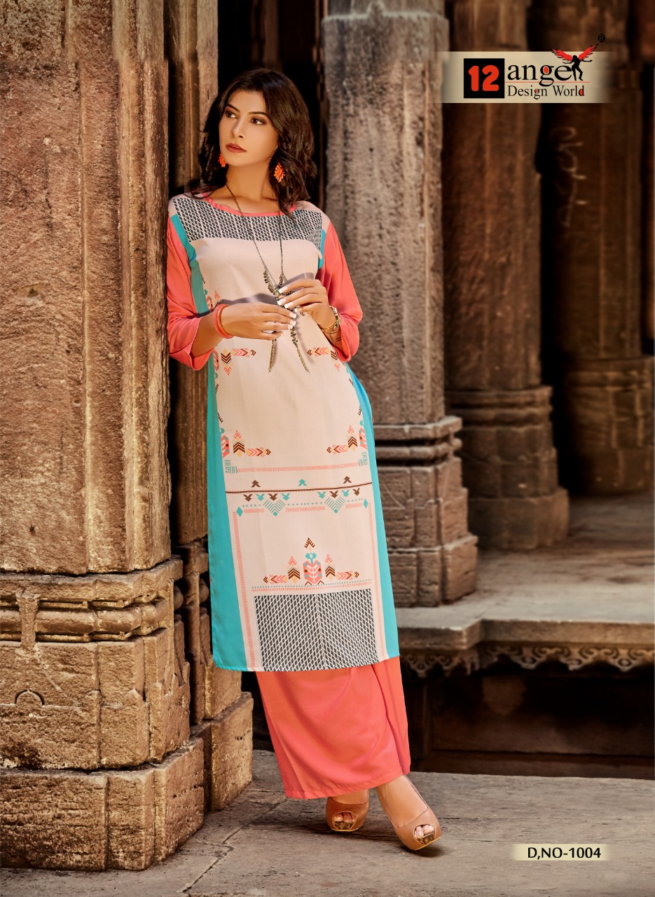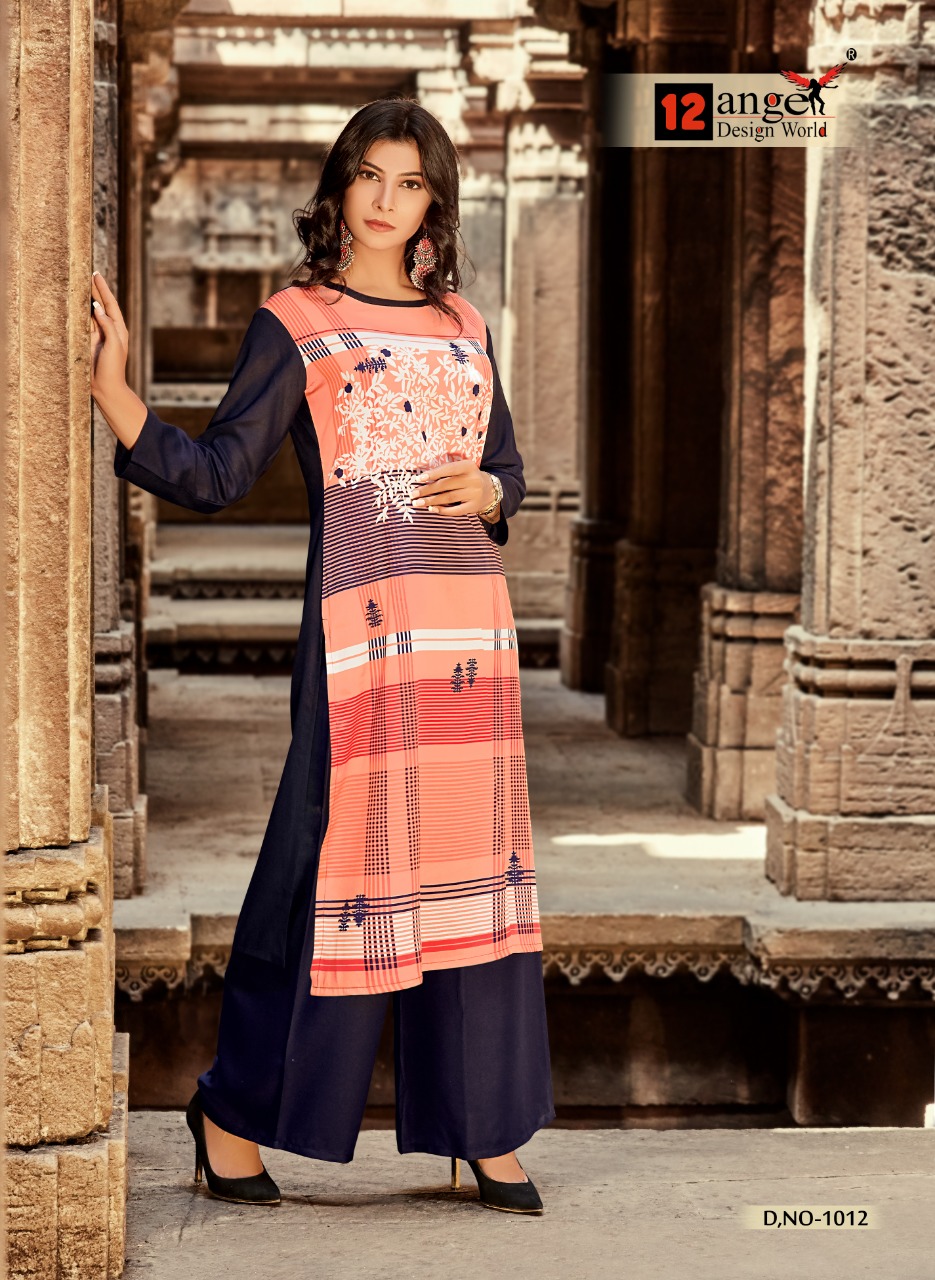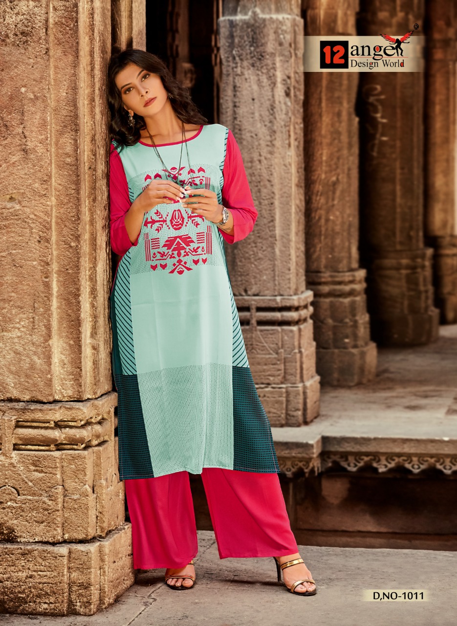 Buy Online Heritage By 12angel 1001 Series Designer Reyon Digital Printed Kurti With Plazzo Catlog Wholesale Dealer Surat 12 Pcs of Full Catalogue at Wholesale Price. Looking for Heritage By 12angel 1001 Series Designer Reyon Digital Printed Kurti With Plazzo Catlog Wholesale Dealer Surat Full Catalouge at Best Price? Buy Now Heritage By 12angel 1001 Series Designer Reyon Digital Printed Kurti With Plazzo Catlog Wholesale Dealer Surat at Wholesale Rate of Rs 5940 with Total 12 Pcs from authroized dealer and supplier of 12 ANGEL Brand. Cost of Each piece is just only Rs 495 which is very low and affordable price to resale the product in your retail store ,This is Surat based Wholesale Supplier & Dealer of 12 ANGEL Brand. Click on Brand name to Know more about 12 ANGEL Brand's products.Call or Whatsapp on 9898838984 for booking or enquiry