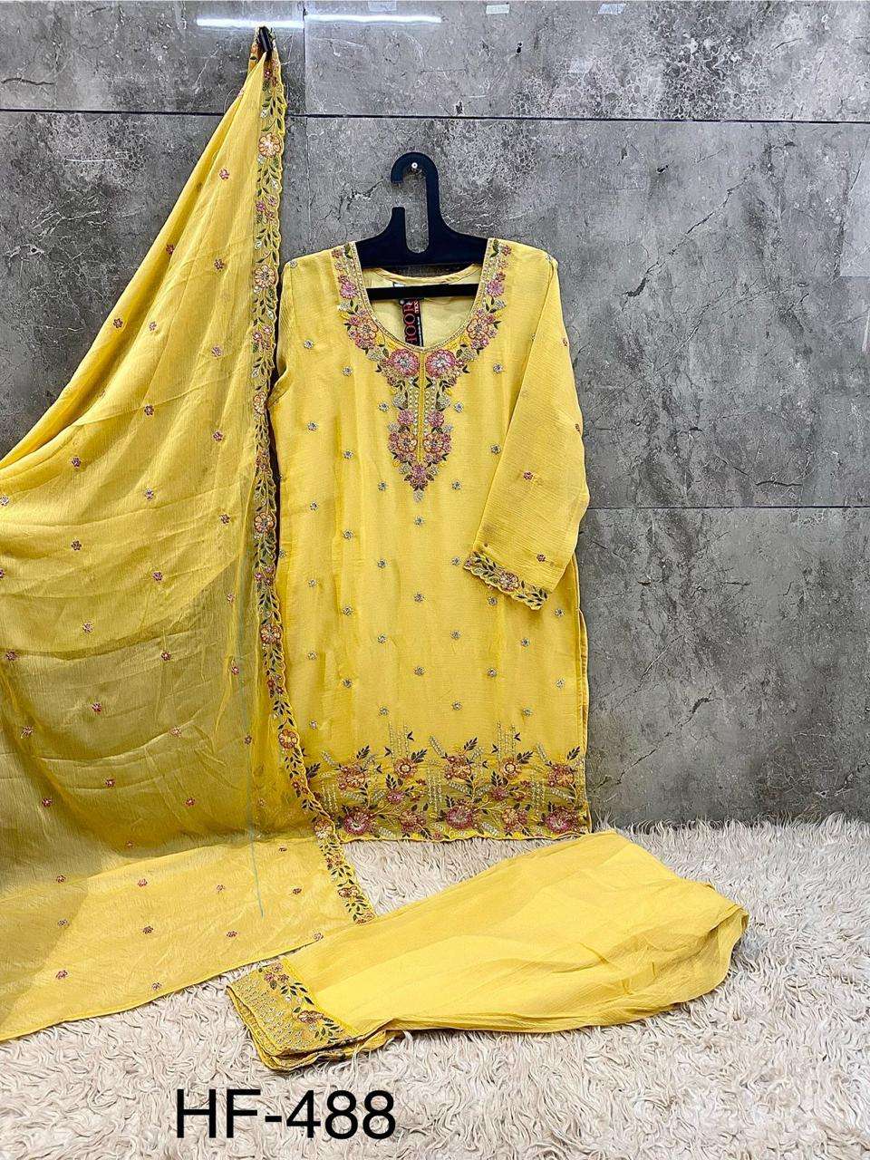 Buy Online HF 488 A To D by Hoor Tex Suit collection manufacturers surat 4 Pcs of Full Catalogue at Wholesale Price. Looking for HF 488 A To D by Hoor Tex Suit collection manufacturers surat Full Catalouge at Best Price? Buy Now HF 488 A To D by Hoor Tex Suit collection manufacturers surat at Wholesale Rate of Rs 5800 with Total 4 Pcs from authroized dealer and supplier of HOOR TEX Brand. Cost of Each piece is just only Rs 1450 which is very low and affordable price to resale the product in your retail store ,This is Surat based Wholesale Supplier & Dealer of HOOR TEX Brand. Click on Brand name to Know more about HOOR TEX Brand's products.Call or Whatsapp on 9898838984 for booking or enquiry
