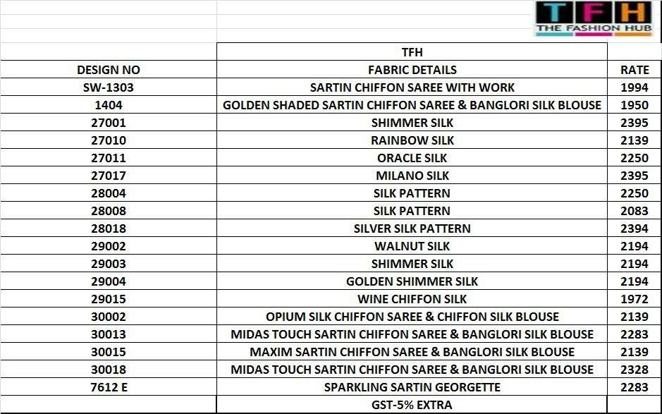Buy Online HIT DESIGNS by TFH SAREE collection manufacturer surat 18 Pcs of Full Catalogue at Wholesale Price. Looking for HIT DESIGNS by TFH SAREE collection manufacturer surat Full Catalouge at Best Price? Buy Now HIT DESIGNS by TFH SAREE collection manufacturer surat at Wholesale Rate of Rs 0 with Total 18 Pcs from authroized dealer and supplier of TFH Brand. Cost of Each piece is just only Rs 0 which is very low and affordable price to resale the product in your retail store ,This is Surat based Wholesale Supplier & Dealer of TFH Brand. Click on Brand name to Know more about TFH Brand's products.Call or Whatsapp on 9898838984 for booking or enquiry