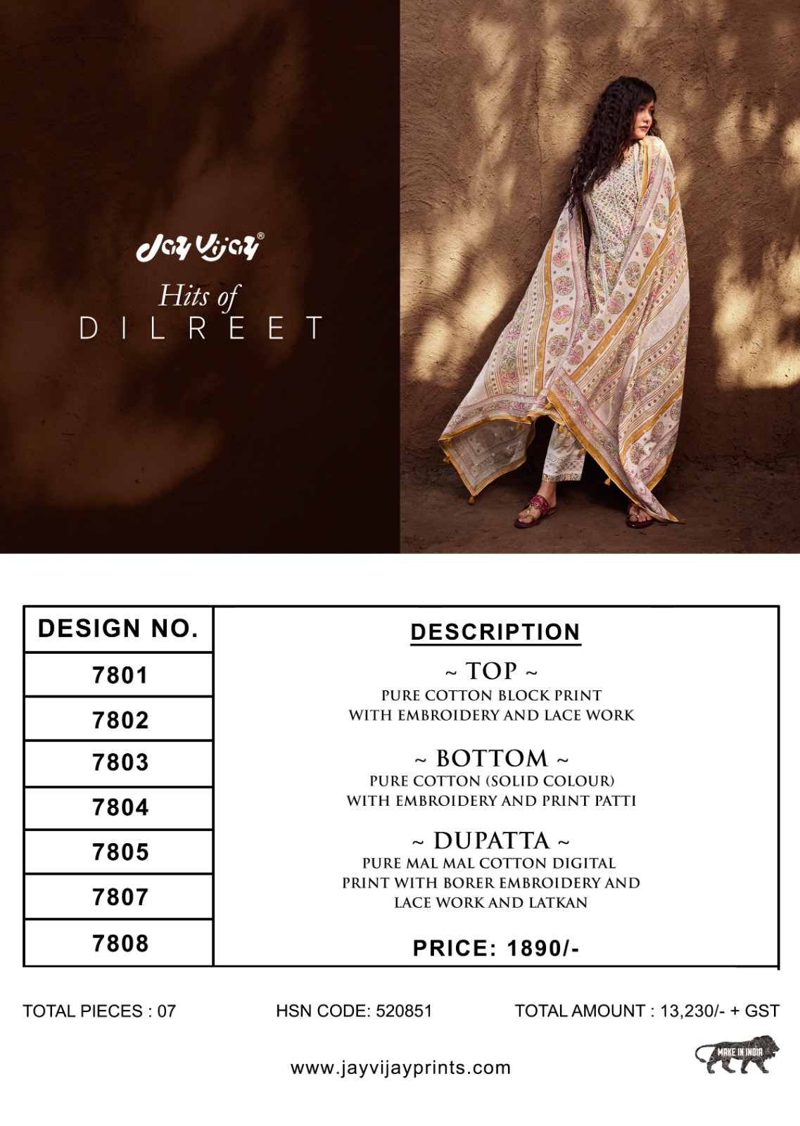 Buy Online Hit Of Dilreet By Jayvijay Pure Cotton Suit Manufacturer Surat 7 Pcs of Full Catalogue at Wholesale Price. Looking for Hit Of Dilreet By Jayvijay Pure Cotton Suit Manufacturer Surat Full Catalouge at Best Price? Buy Now Hit Of Dilreet By Jayvijay Pure Cotton Suit Manufacturer Surat at Wholesale Rate of Rs 13230 with Total 7 Pcs from authroized dealer and supplier of JAY VIJAY Brand. Cost of Each piece is just only Rs 1890 which is very low and affordable price to resale the product in your retail store ,This is Surat based Wholesale Supplier & Dealer of JAY VIJAY Brand. Click on Brand name to Know more about JAY VIJAY Brand's products.Call or Whatsapp on 9898838984 for booking or enquiry