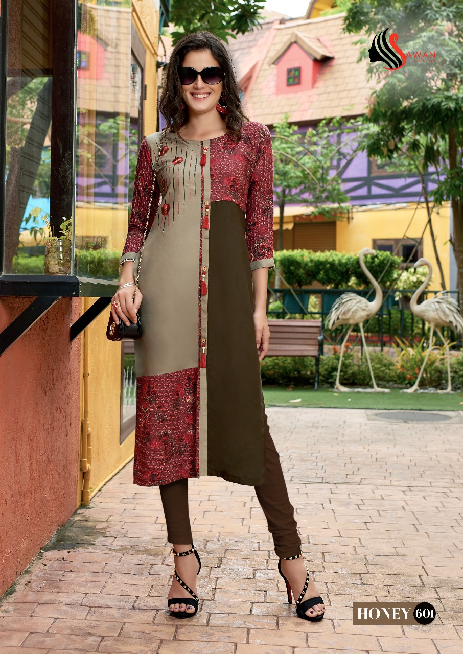 Honey Vol 6 By Sawan Creation Heavy Reyon Printed Long Straight Kurtis Wholesale Supplier And Dealer Surat