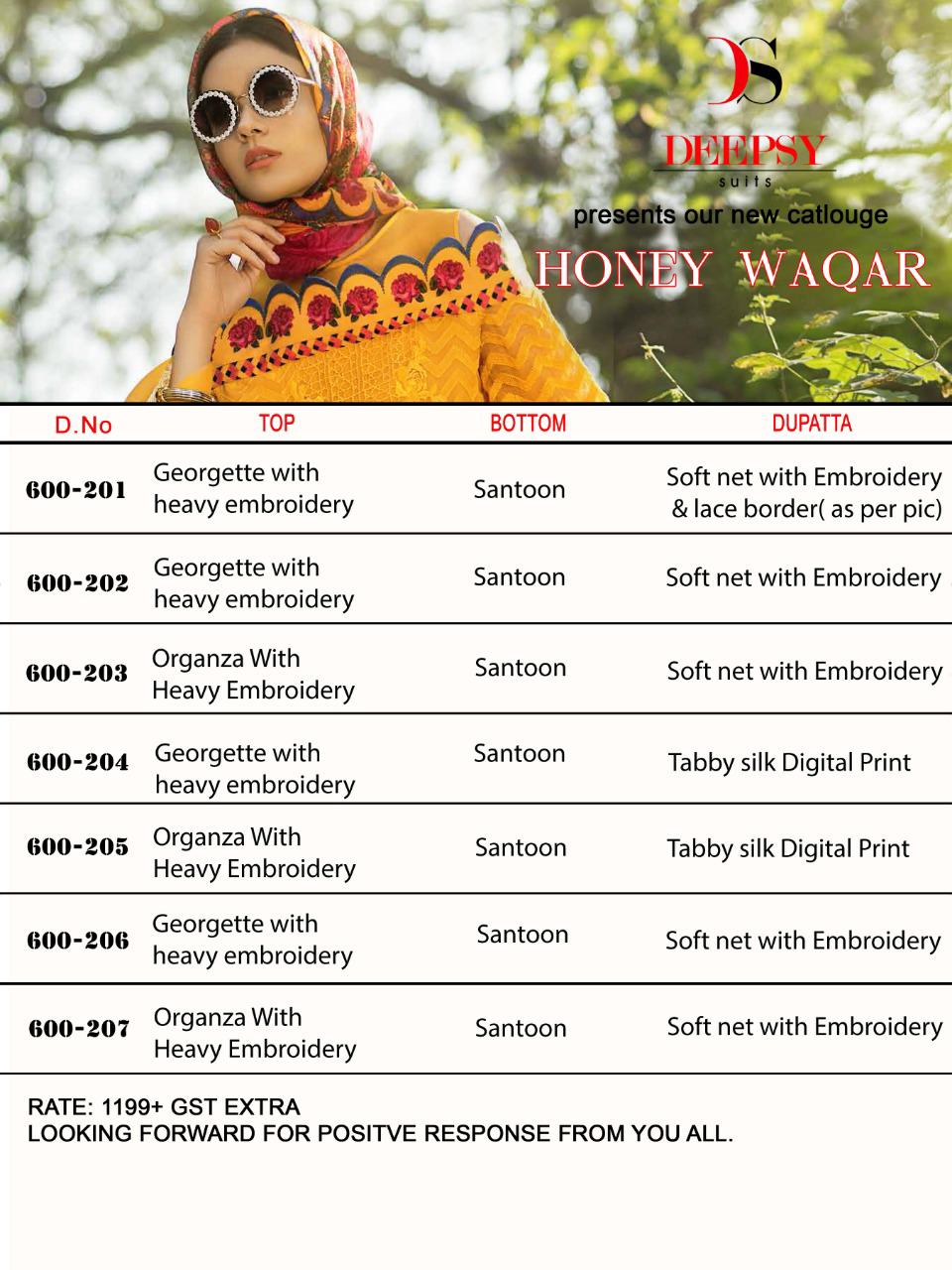 Buy Online Honey Waqar By Deepsy 600201 Series Fancy Georgette Pakistani Style Suit Collection Wholesaler Surat 7 Pcs of Full Catalogue at Wholesale Price. Looking for Honey Waqar By Deepsy 600201 Series Fancy Georgette Pakistani Style Suit Collection Wholesaler Surat Full Catalouge at Best Price? Buy Now Honey Waqar By Deepsy 600201 Series Fancy Georgette Pakistani Style Suit Collection Wholesaler Surat at Wholesale Rate of Rs 8393 with Total 7 Pcs from authroized dealer and supplier of DEEPSY Brand. Cost of Each piece is just only Rs 1199 which is very low and affordable price to resale the product in your retail store ,This is Surat based Wholesale Supplier & Dealer of DEEPSY Brand. Click on Brand name to Know more about DEEPSY Brand's products.Call or Whatsapp on 9898838984 for booking or enquiry