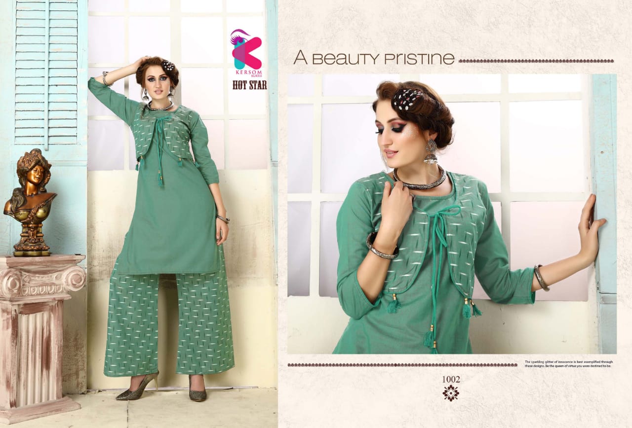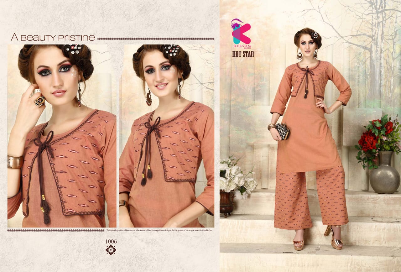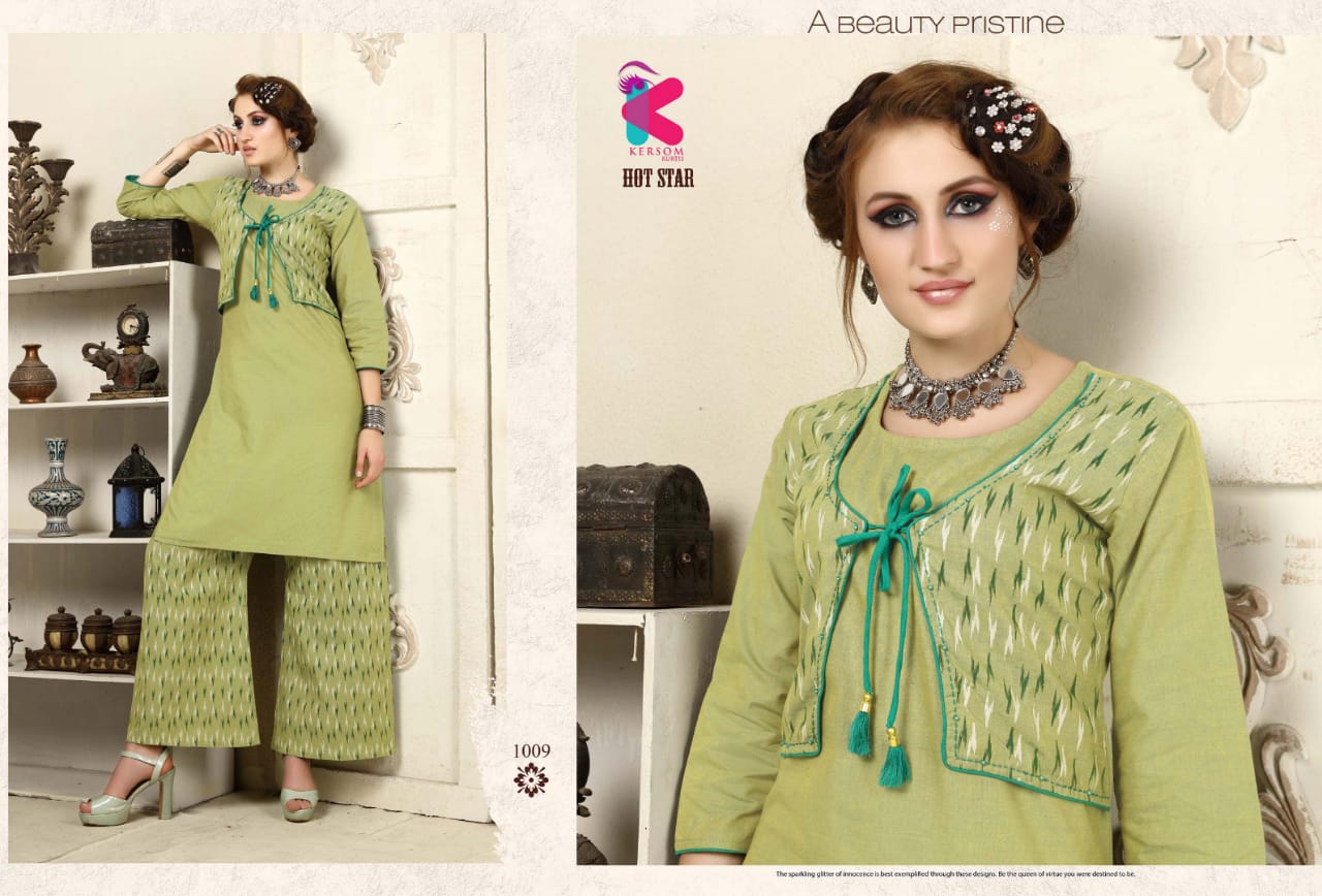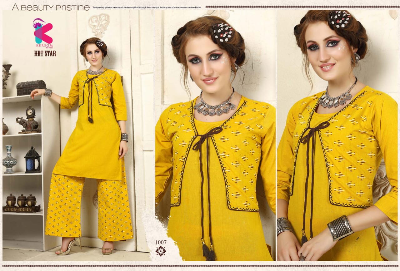 Buy Online Hot Star By Kersom Cotton Kurtis With Plazzo Collection Wholesale Dealer And Exporter Nitya Nx Surat 10 Pcs of Full Catalogue at Wholesale Price. Looking for Hot Star By Kersom Cotton Kurtis With Plazzo Collection Wholesale Dealer And Exporter Nitya Nx Surat Full Catalouge at Best Price? Buy Now Hot Star By Kersom Cotton Kurtis With Plazzo Collection Wholesale Dealer And Exporter Nitya Nx Surat at Wholesale Rate of Rs 5850 with Total 10 Pcs from authroized dealer and supplier of Kersom kurtis Brand. Cost of Each piece is just only Rs 585 which is very low and affordable price to resale the product in your retail store ,This is Surat based Wholesale Supplier & Dealer of Kersom kurtis Brand. Click on Brand name to Know more about Kersom kurtis Brand's products.Call or Whatsapp on 9898838984 for booking or enquiry