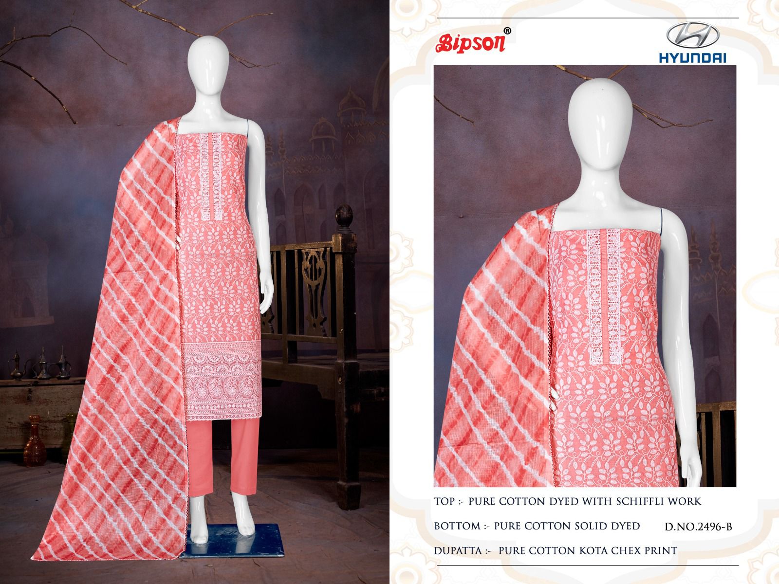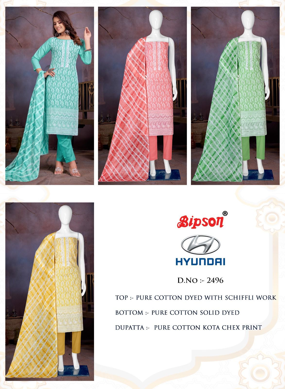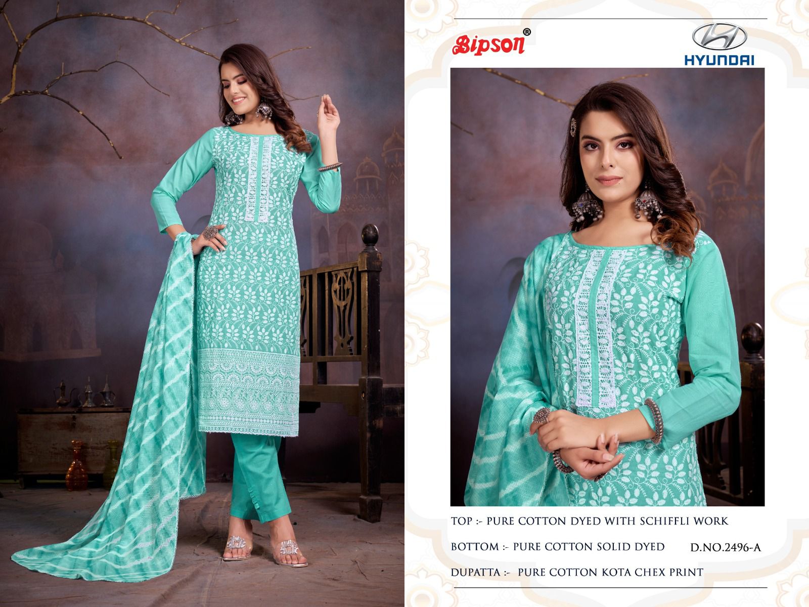 BIPSON PRINTS PVT PLT BIPSON FACTORY OUTLET Premium COTTON Collection HYUNDAI - 2496 TOP :- Pure Soft Cotton Dyed With Shiffli Embroidery Work . BOTTOM :- Pure Cotton Solid Dyed . DUPATTA :- Pure Cotton Kota Chex Print . @ 545 /- per pcs GST EXTRA Set to set book now |