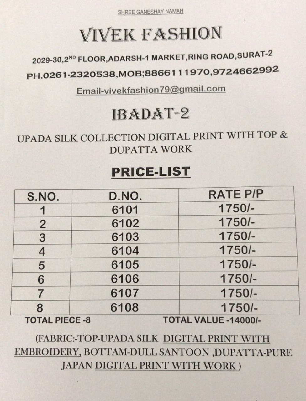 Buy Online Ibadat 2 By Vivek Upada Silk Desinger Party Wear Dresses Wholesale Supplier And Dealer Gujarat 8 Pcs of Full Catalogue at Wholesale Price. Looking for Ibadat 2 By Vivek Upada Silk Desinger Party Wear Dresses Wholesale Supplier And Dealer Gujarat Full Catalouge at Best Price? Buy Now Ibadat 2 By Vivek Upada Silk Desinger Party Wear Dresses Wholesale Supplier And Dealer Gujarat at Wholesale Rate of Rs 14000 with Total 8 Pcs from authroized dealer and supplier of VIVEK FASHION Brand. Cost of Each piece is just only Rs 1750 which is very low and affordable price to resale the product in your retail store ,This is Surat based Wholesale Supplier & Dealer of VIVEK FASHION Brand. Click on Brand name to Know more about VIVEK FASHION Brand's products.Call or Whatsapp on 9898838984 for booking or enquiry