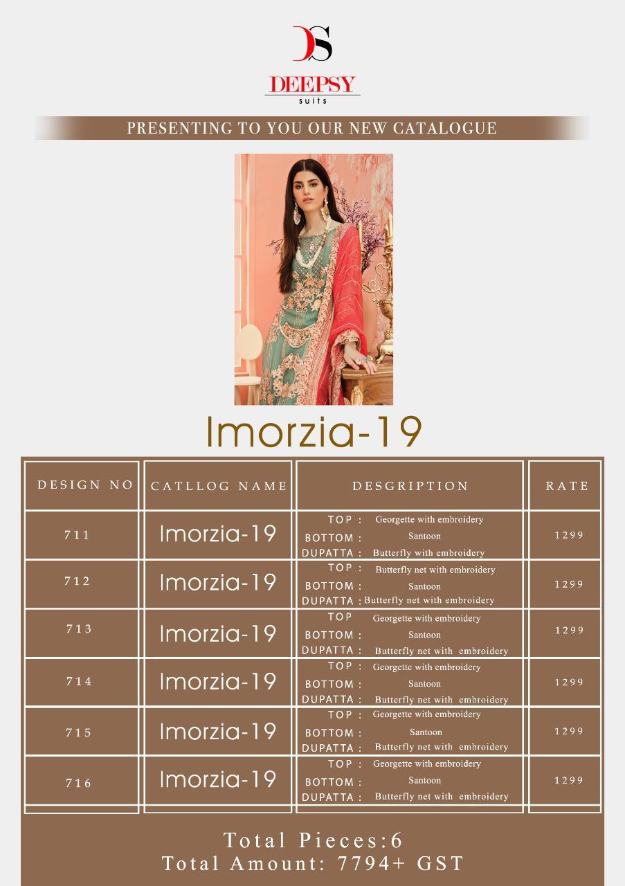 Buy Online Imprzia 19 By Deepsy Series 711 To 716 Pakistani Suits Wholesale Supplier And Dealer Surat 6 Pcs of Full Catalogue at Wholesale Price. Looking for Imprzia 19 By Deepsy Series 711 To 716 Pakistani Suits Wholesale Supplier And Dealer Surat Full Catalouge at Best Price? Buy Now Imprzia 19 By Deepsy Series 711 To 716 Pakistani Suits Wholesale Supplier And Dealer Surat at Wholesale Rate of Rs 7794 with Total 6 Pcs from authroized dealer and supplier of Brand. Cost of Each piece is just only Rs 1299 which is very low and affordable price to resale the product in your retail store ,This is Surat based Wholesale Supplier & Dealer of Brand. Click on Brand name to Know more about Brand's products.Call or Whatsapp on 9898838984 for booking or enquiry