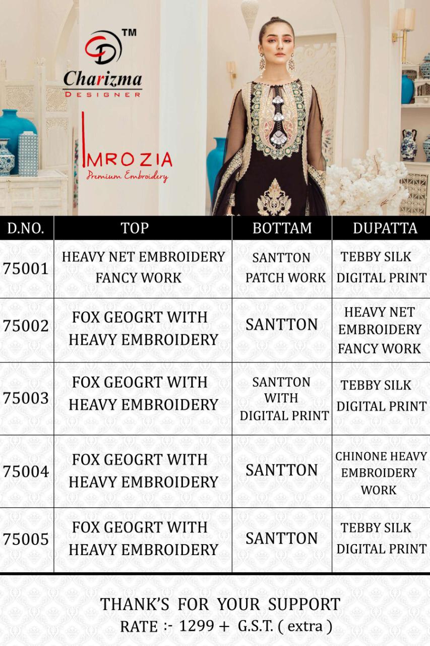 Buy Online Imrozia Exclusive By Charizma Designer Party Wear Suits Wholesale Supplier Gujarat 5 Pcs of Full Catalogue at Wholesale Price. Looking for Imrozia Exclusive By Charizma Designer Party Wear Suits Wholesale Supplier Gujarat Full Catalouge at Best Price? Buy Now Imrozia Exclusive By Charizma Designer Party Wear Suits Wholesale Supplier Gujarat at Wholesale Rate of Rs 6495 with Total 5 Pcs from authroized dealer and supplier of Brand. Cost of Each piece is just only Rs 1299 which is very low and affordable price to resale the product in your retail store ,This is Surat based Wholesale Supplier & Dealer of Brand. Click on Brand name to Know more about Brand's products.Call or Whatsapp on 9898838984 for booking or enquiry