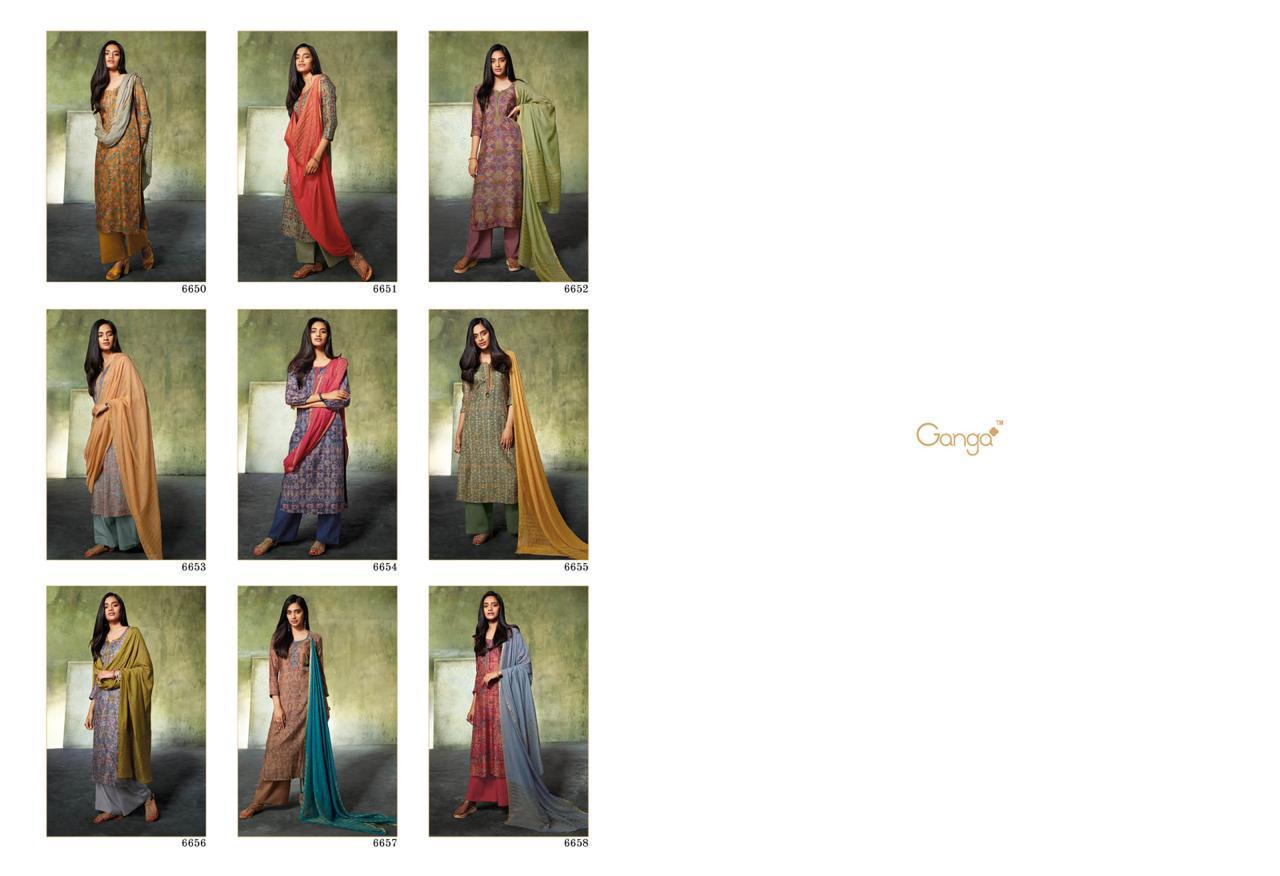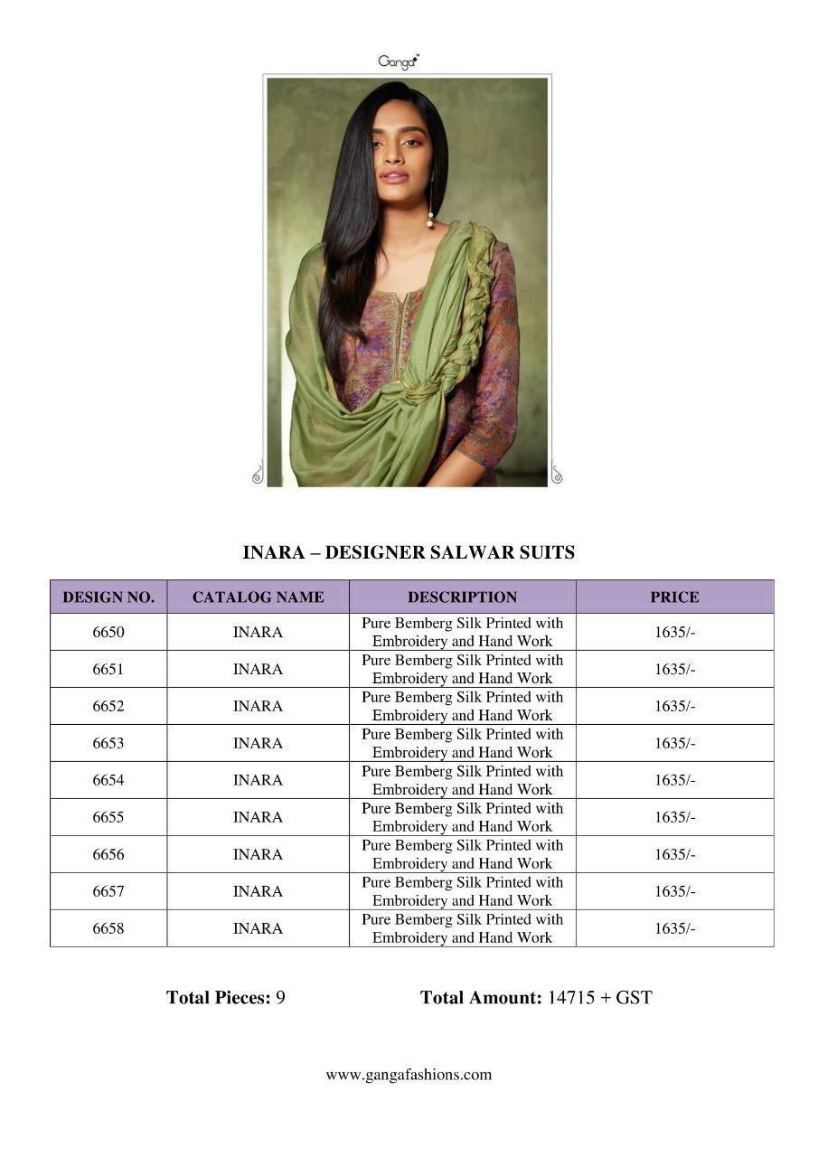 Buy Online Inara By Ganga 6650 Series Fancy Party Wear Silk Printed Salwar Kameez Catlog Wholesale Dealer Surat 9 Pcs of Full Catalogue at Wholesale Price. Looking for Inara By Ganga 6650 Series Fancy Party Wear Silk Printed Salwar Kameez Catlog Wholesale Dealer Surat Full Catalouge at Best Price? Buy Now Inara By Ganga 6650 Series Fancy Party Wear Silk Printed Salwar Kameez Catlog Wholesale Dealer Surat at Wholesale Rate of Rs 14715 with Total 9 Pcs from authroized dealer and supplier of GANGA Brand. Cost of Each piece is just only Rs 1635 which is very low and affordable price to resale the product in your retail store ,This is Surat based Wholesale Supplier & Dealer of GANGA Brand. Click on Brand name to Know more about GANGA Brand's products.Call or Whatsapp on 9898838984 for booking or enquiry