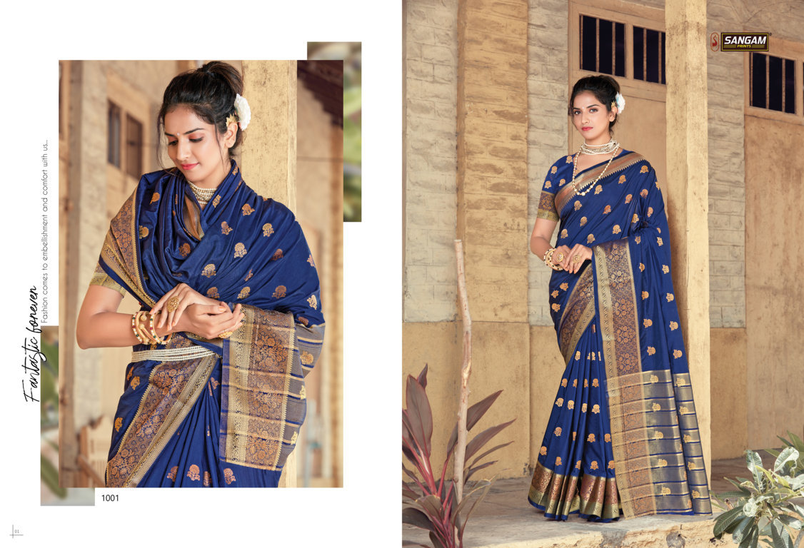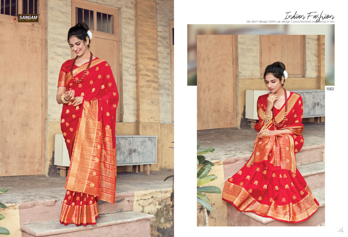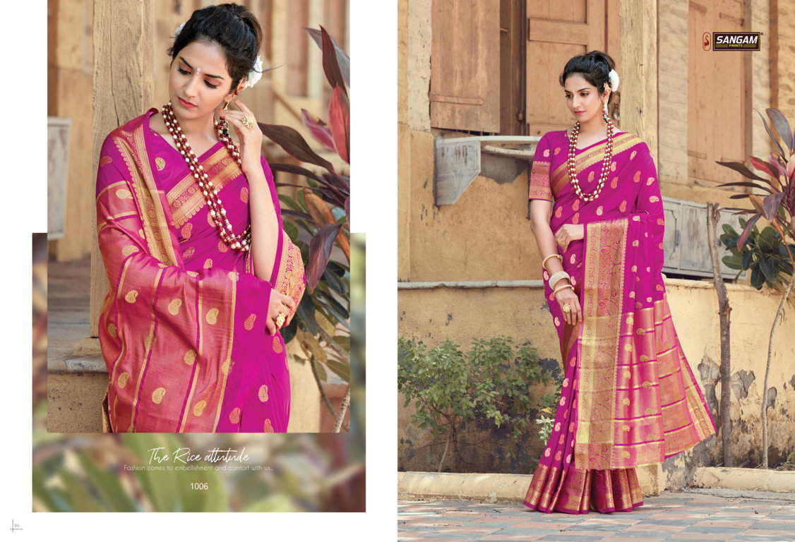 Brand- Sangam Catalog Name : INDRANI SILK Saree Size : 5.50 Mtr Blouse Fabric : 0.80 Mtr Saree Fabric : Silk Blouse Fabric : Silk Price : 1045/-Gst Extra Set to set |