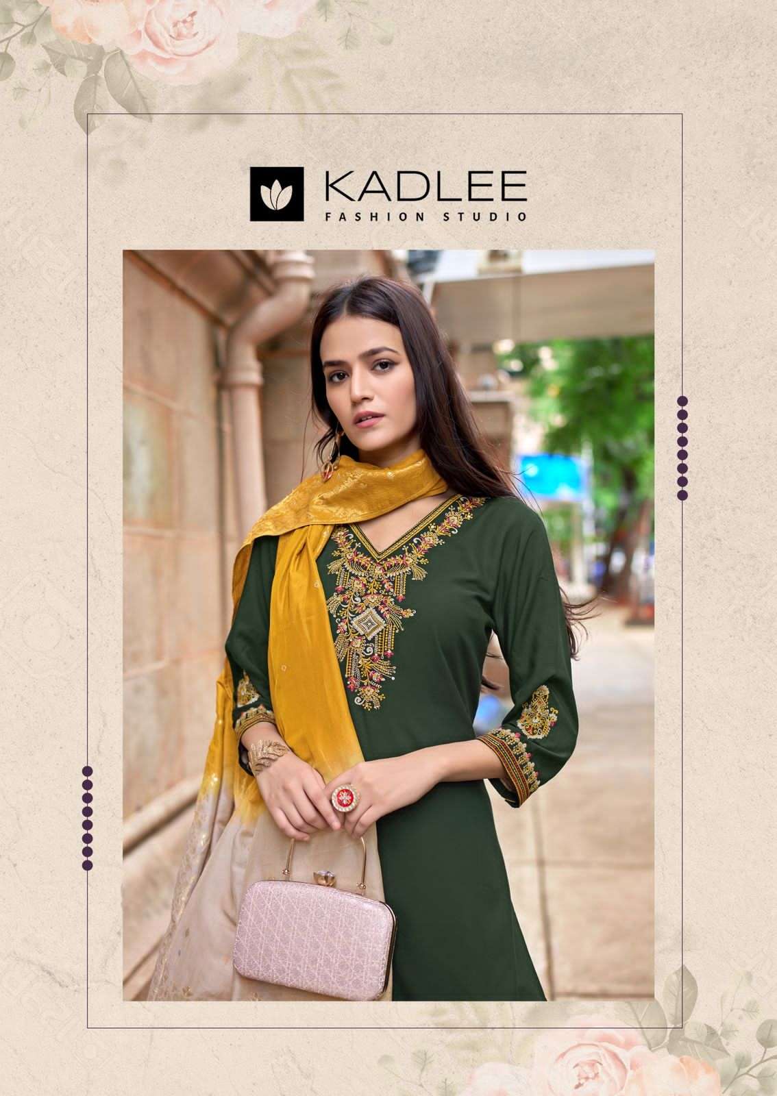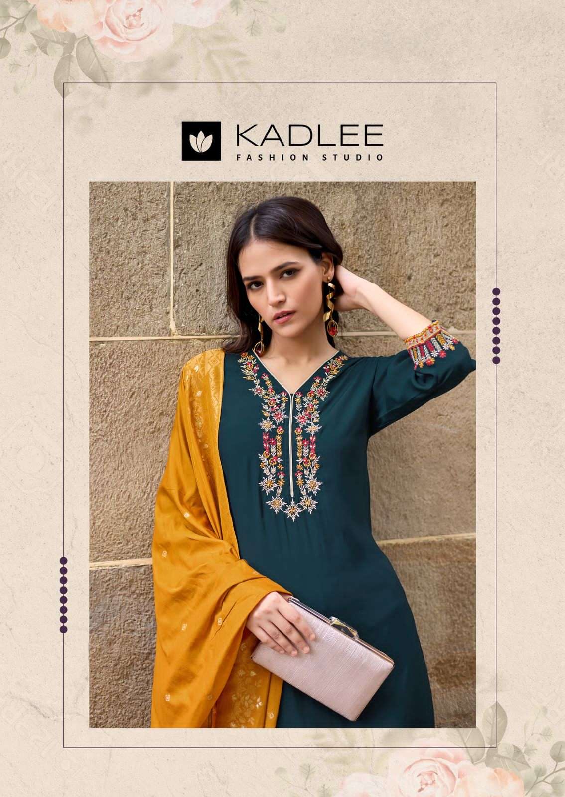 Lable : KADLEE Catalog : Indriya Design : 6 Top : Heavy Rayon Work : Thread & Handwork Bottom : Heavy Rayon Dupptta : Pure Musline Jequard