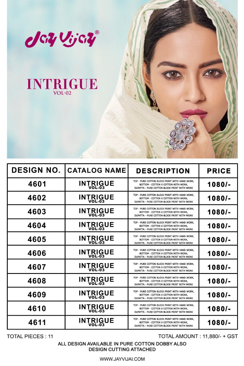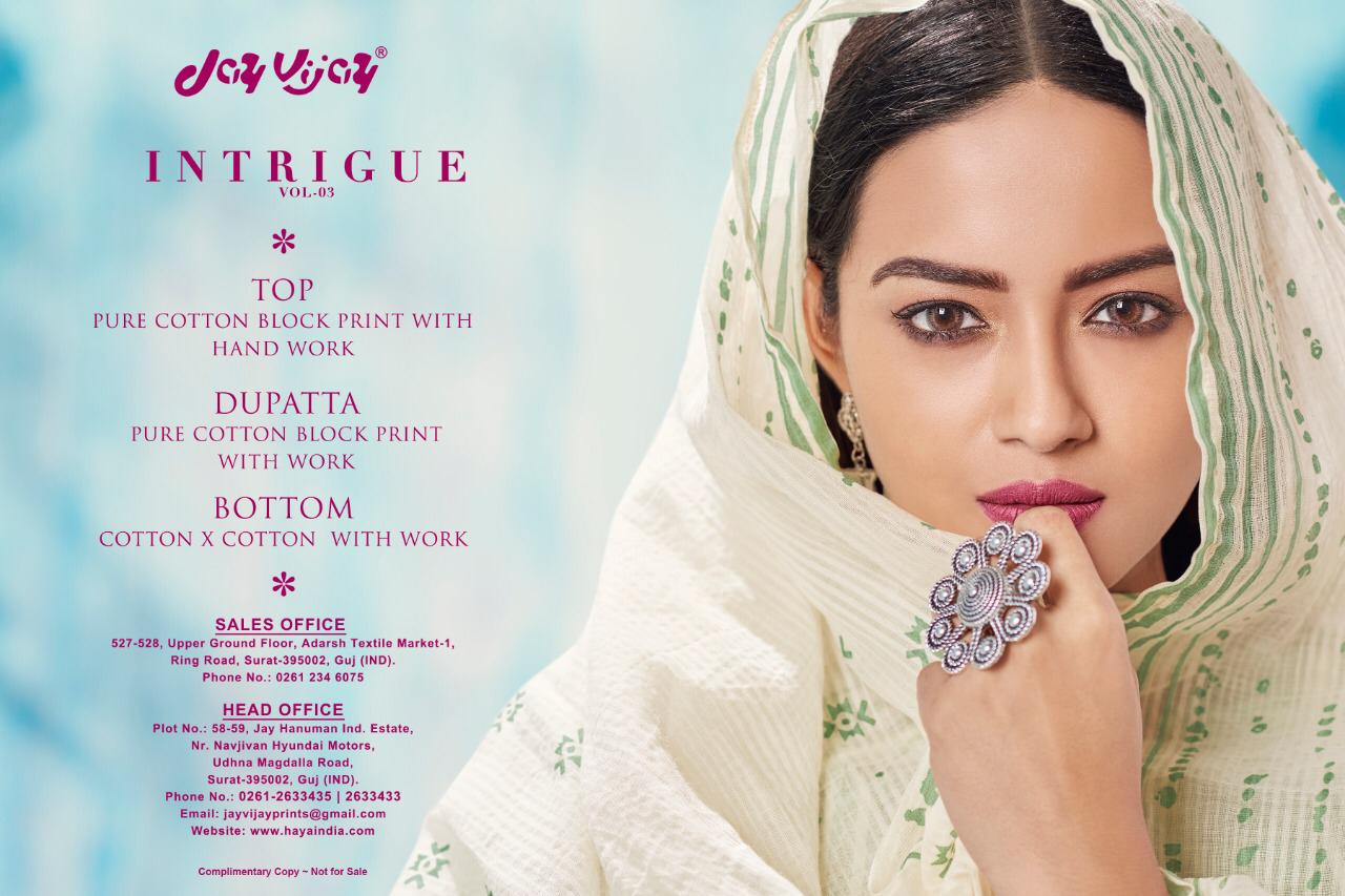 Buy Online Intrigue Vol 2 By Jay Vijay Cotton Block Printed Suits Wholesale Supplier Surat 11 Pcs of Full Catalogue at Wholesale Price. Looking for Intrigue Vol 2 By Jay Vijay Cotton Block Printed Suits Wholesale Supplier Surat Full Catalouge at Best Price? Buy Now Intrigue Vol 2 By Jay Vijay Cotton Block Printed Suits Wholesale Supplier Surat at Wholesale Rate of Rs 11880 with Total 11 Pcs from authroized dealer and supplier of JAY VIJAY Brand. Cost of Each piece is just only Rs 1080 which is very low and affordable price to resale the product in your retail store ,This is Surat based Wholesale Supplier & Dealer of JAY VIJAY Brand. Click on Brand name to Know more about JAY VIJAY Brand's products.Call or Whatsapp on 9898838984 for booking or enquiry