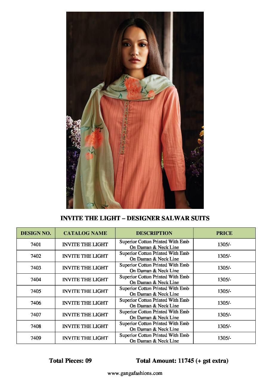 Buy Online Invite The Light By Ganga Cotton Embroidered Suits Wholesale Supplier Surat 9 Pcs of Full Catalogue at Wholesale Price. Looking for Invite The Light By Ganga Cotton Embroidered Suits Wholesale Supplier Surat Full Catalouge at Best Price? Buy Now Invite The Light By Ganga Cotton Embroidered Suits Wholesale Supplier Surat at Wholesale Rate of Rs 11745 with Total 9 Pcs from authroized dealer and supplier of GANGA Brand. Cost of Each piece is just only Rs 1305 which is very low and affordable price to resale the product in your retail store ,This is Surat based Wholesale Supplier & Dealer of GANGA Brand. Click on Brand name to Know more about GANGA Brand's products.Call or Whatsapp on 9898838984 for booking or enquiry