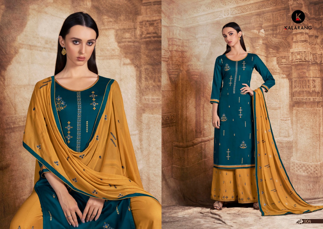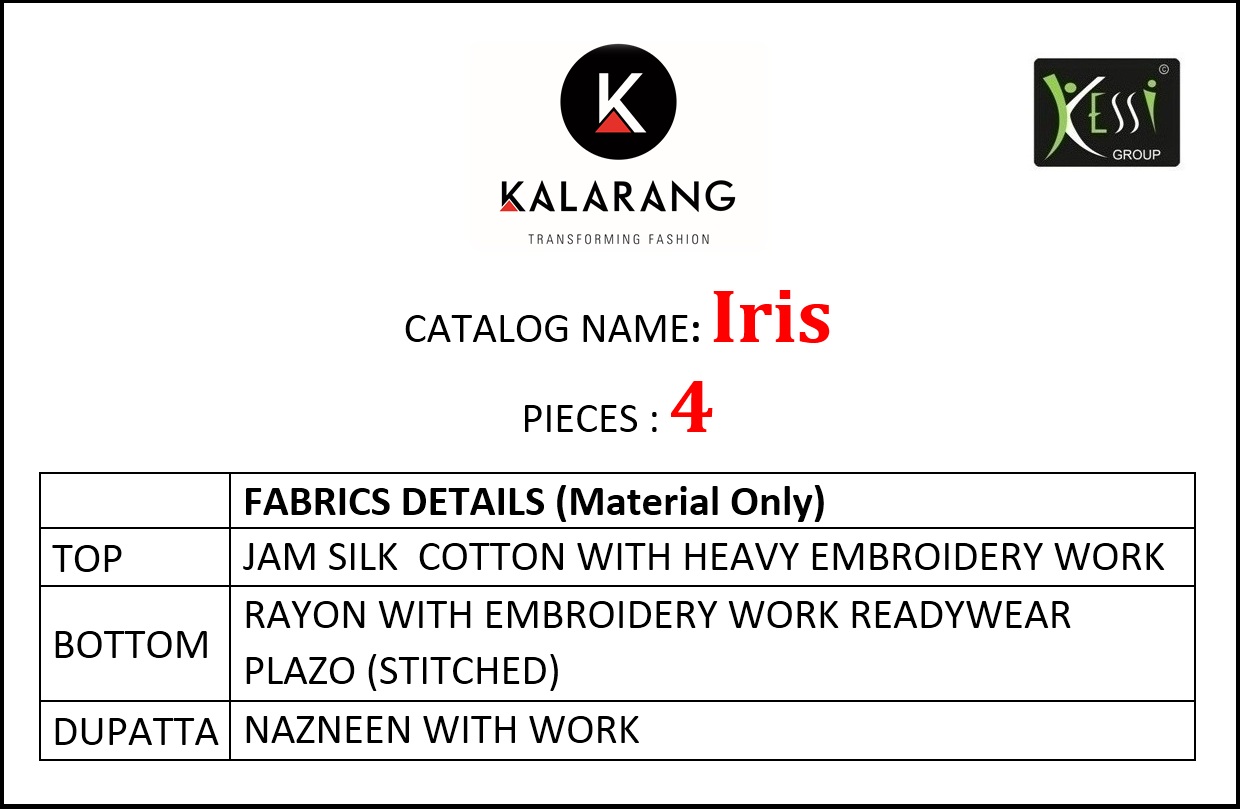 ? *Kalarang.* has launched _Catalog name _: *Iris* ? _Fabric Details_ ? ?Top:- JAM SILK COTTON WITH HEAVY EMBROIDERY WORK ?Bottom:- RAYON WITH EMBROIDERY WORK READYWEAR PLAZO (STITCHED) ?Dupatta:- NAZNEEN WITH WORK ?Total Design:- 4 Rate 799 |