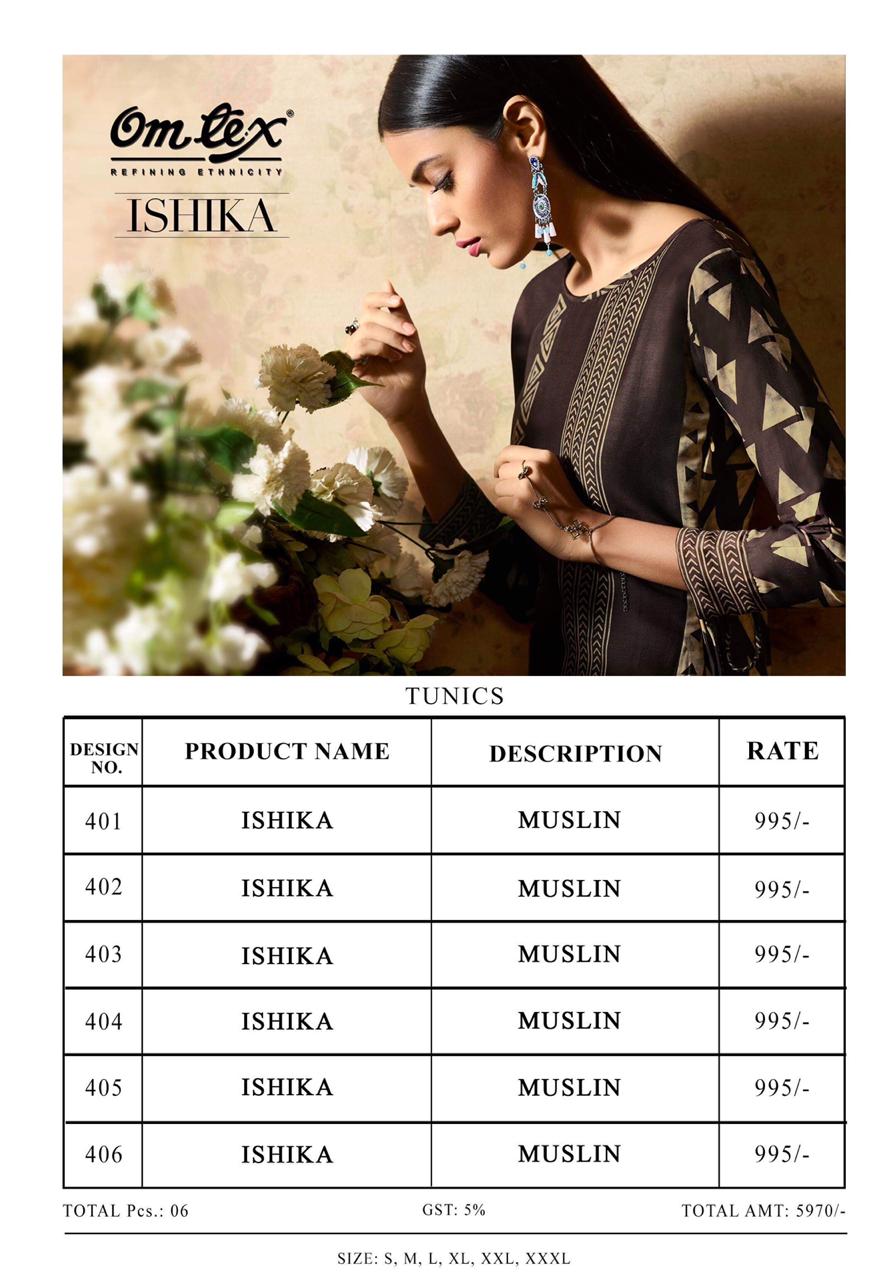 Buy Online Ishika By Omtex Series 401 To 406 Designer Party Wear Kurtis Wholesale Supplier Surat 6 Pcs of Full Catalogue at Wholesale Price. Looking for Ishika By Omtex Series 401 To 406 Designer Party Wear Kurtis Wholesale Supplier Surat Full Catalouge at Best Price? Buy Now Ishika By Omtex Series 401 To 406 Designer Party Wear Kurtis Wholesale Supplier Surat at Wholesale Rate of Rs 5970 with Total 6 Pcs from authroized dealer and supplier of OM TEX Brand. Cost of Each piece is just only Rs 995 which is very low and affordable price to resale the product in your retail store ,This is Surat based Wholesale Supplier & Dealer of OM TEX Brand. Click on Brand name to Know more about OM TEX Brand's products.Call or Whatsapp on 9898838984 for booking or enquiry