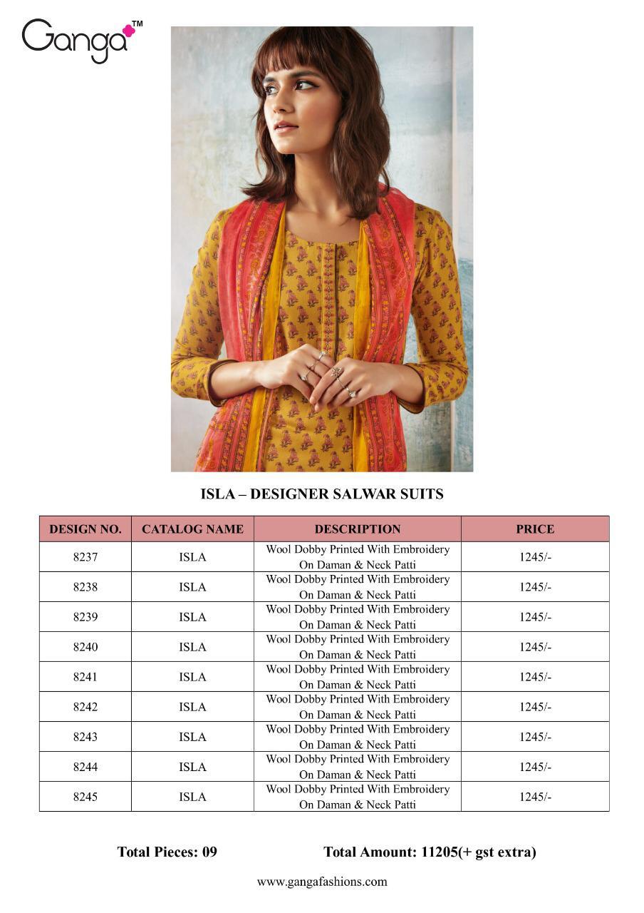 Buy Online Isla By Ganga Series 8237 Woolen Collection Wholesale Supplier And Dealer Surat 9 Pcs of Full Catalogue at Wholesale Price. Looking for Isla By Ganga Series 8237 Woolen Collection Wholesale Supplier And Dealer Surat Full Catalouge at Best Price? Buy Now Isla By Ganga Series 8237 Woolen Collection Wholesale Supplier And Dealer Surat at Wholesale Rate of Rs 11205 with Total 9 Pcs from authroized dealer and supplier of GANGA Brand. Cost of Each piece is just only Rs 1245 which is very low and affordable price to resale the product in your retail store ,This is Surat based Wholesale Supplier & Dealer of GANGA Brand. Click on Brand name to Know more about GANGA Brand's products.Call or Whatsapp on 9898838984 for booking or enquiry