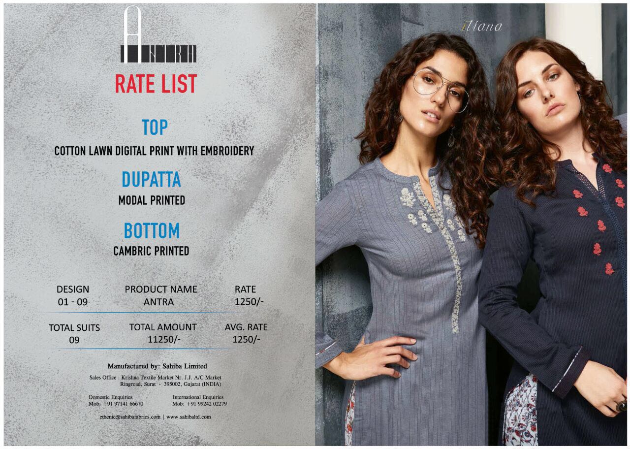 Buy Online Itrana Antra 1 To 9 Series Fancy Cotton Lawn Printed Suits 9 Pcs of Full Catalogue at Wholesale Price. Looking for Itrana Antra 1 To 9 Series Fancy Cotton Lawn Printed Suits Full Catalouge at Best Price? Buy Now Itrana Antra 1 To 9 Series Fancy Cotton Lawn Printed Suits at Wholesale Rate of Rs 11250 with Total 9 Pcs from authroized dealer and supplier of ITRANA Brand. Cost of Each piece is just only Rs 1250 which is very low and affordable price to resale the product in your retail store ,This is Surat based Wholesale Supplier & Dealer of ITRANA Brand. Click on Brand name to Know more about ITRANA Brand's products.Call or Whatsapp on 9898838984 for booking or enquiry