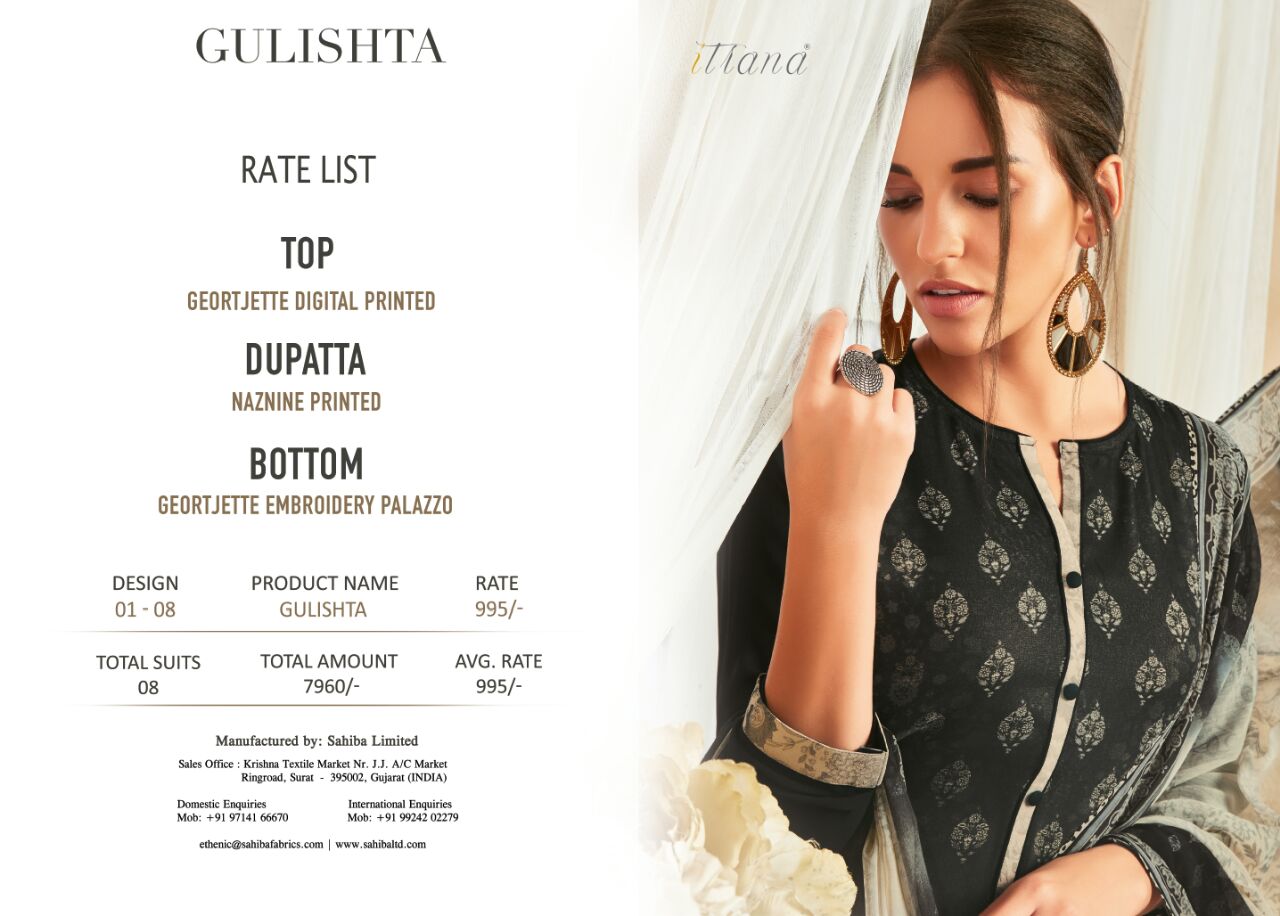 ITRANA-a SAHIBA brand presents its latest Superhit cataloue GULISHTA GEORGET DIGITAL PRINTED TOP WITH NAZNEEN PRINTED DUPATTA AND GEROGET EMBROIDERED PLAZO 995/- 5% GST APPLICABLE ONLY SET TO SET |