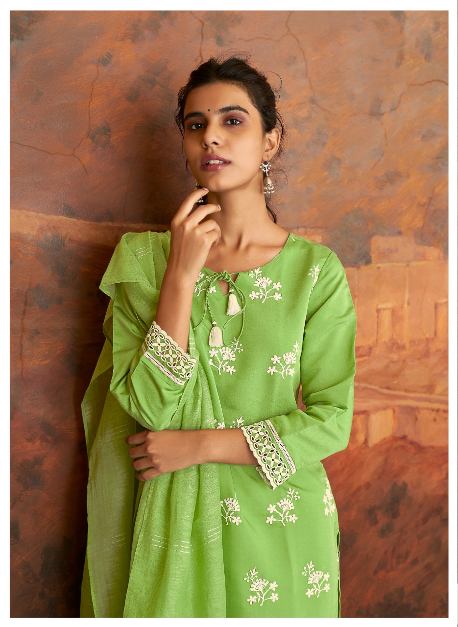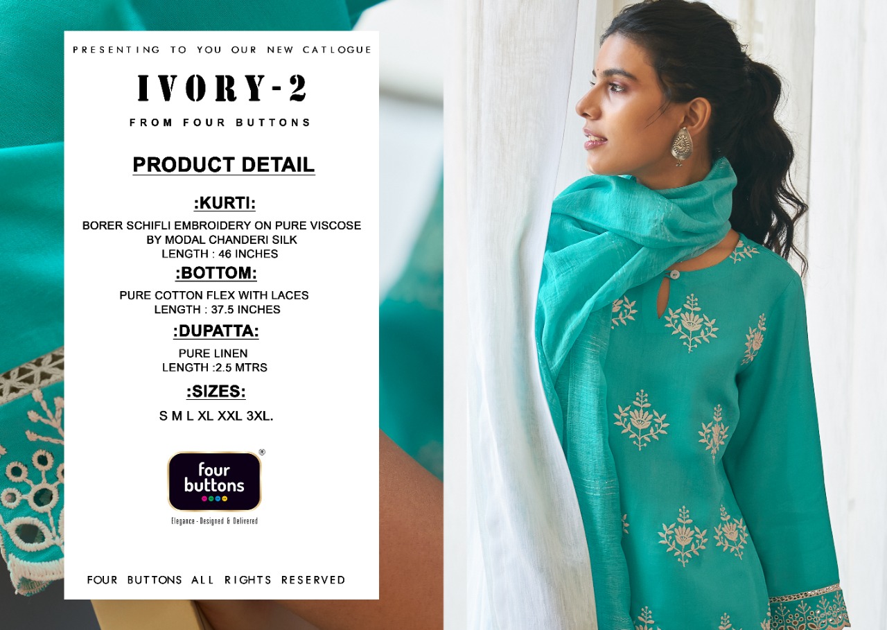 *FOUR BUTTONS* proudly launches its NEW collection 2021 *"IVORY 2"* *FABRIC* *KURTI* - BORER SCHIFLI EMBROIDERY ON VISCOSE BY MODAL CHANDERI *BOTTOM* - PURE COTTON FLEX WITH LACES *DUPATTA*- PURE LINEN WEAVING ZARI *RATE - Rs 1199/-* Set to set. Delivery 2 days SIZES - S, M, L, XL, XXL, 3XL |