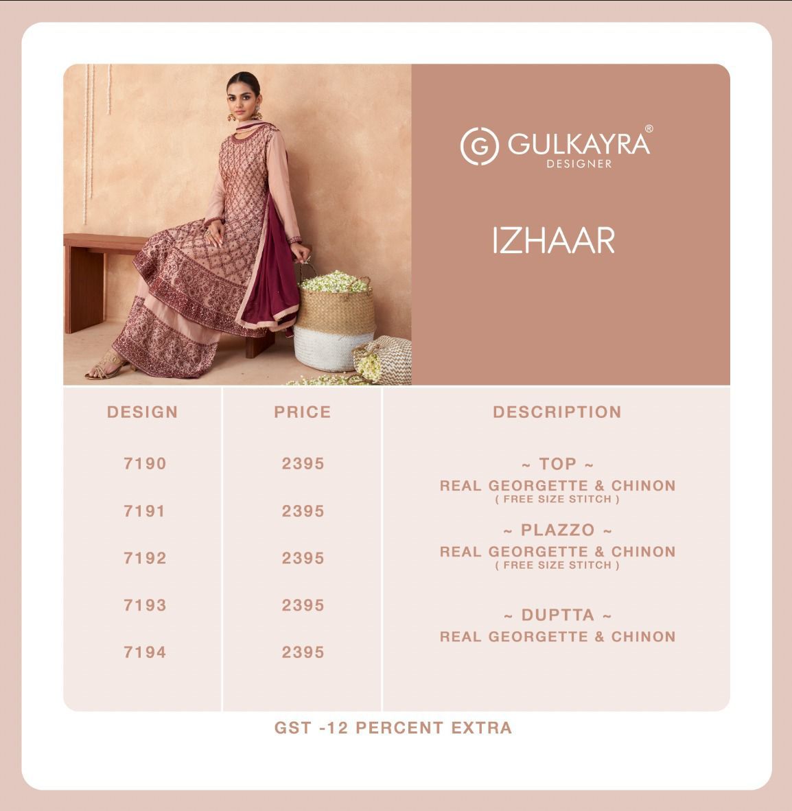 Gulkayra Designer Â?.*IZHAAR*Â?. IZHAAR BY Gulkayra Designer SERIES 7190 TO 7194 Fabric Detail Top - Real Georgette & Chinon Bottom - Real Georgette & Chinon Dupatta- Real Georgette & Chinon Price - 2395 Ready To DispatchÂ?. Note - Free Size Stitched Gst - 12% |