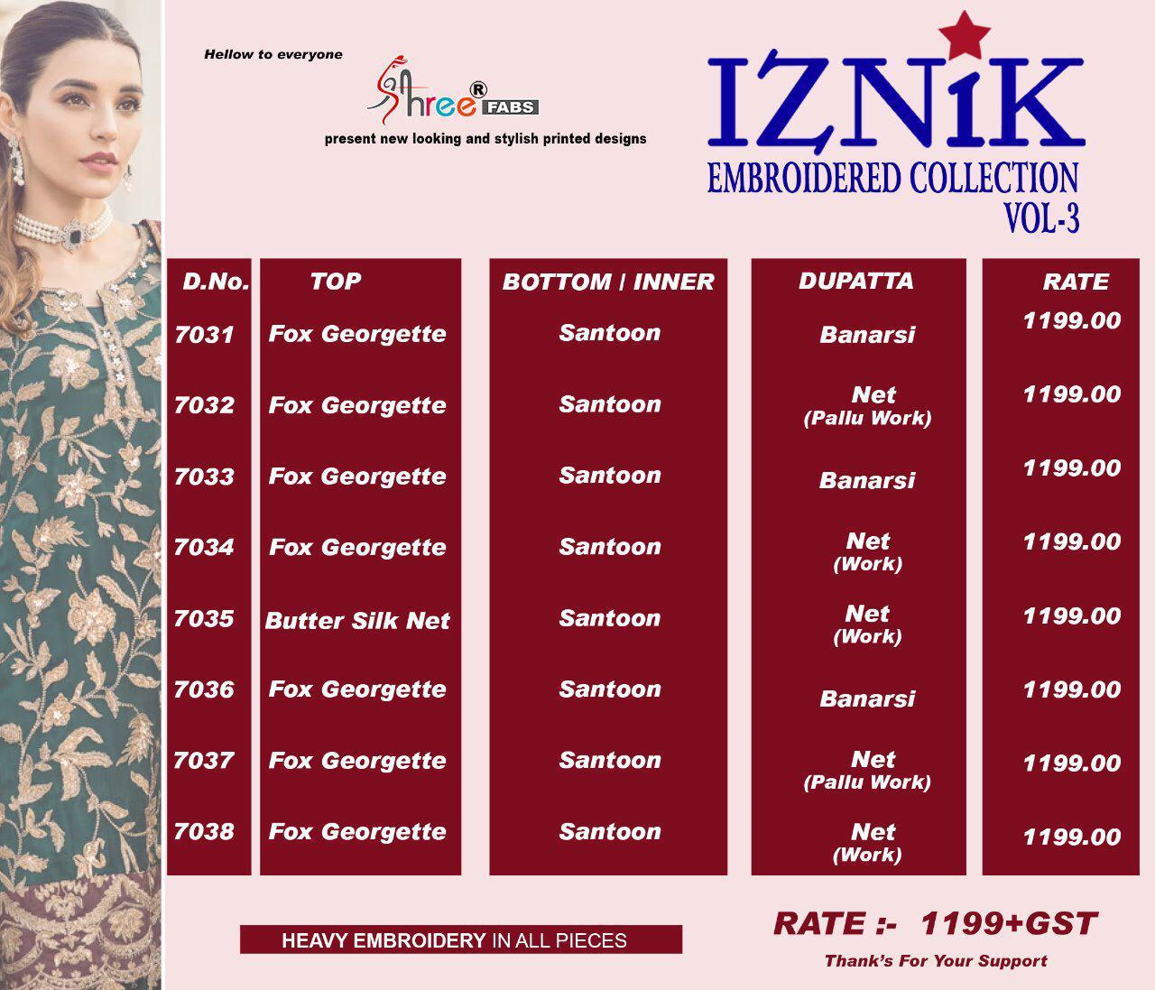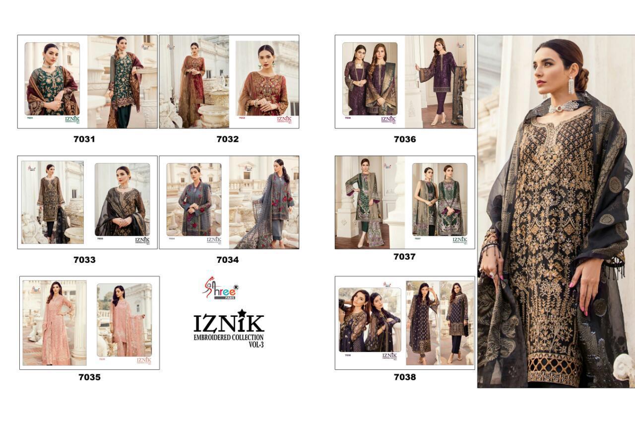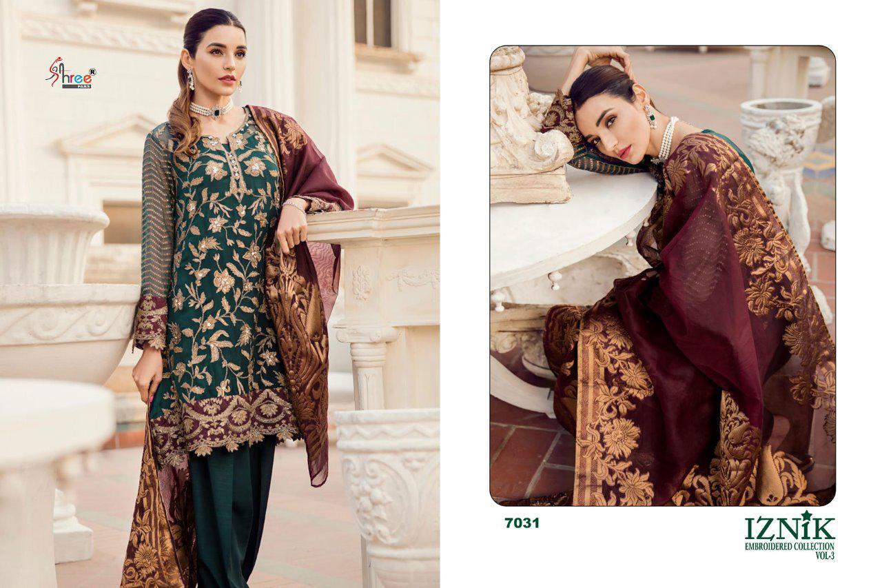 Buy Online Iznik Embroidered Collection Vol 3 By Shree Fabs 7031 Series Fancy Georgette Pakistani Suit Collection Wholesaler Surat 8 Pcs of Full Catalogue at Wholesale Price. Looking for Iznik Embroidered Collection Vol 3 By Shree Fabs 7031 Series Fancy Georgette Pakistani Suit Collection Wholesaler Surat Full Catalouge at Best Price? Buy Now Iznik Embroidered Collection Vol 3 By Shree Fabs 7031 Series Fancy Georgette Pakistani Suit Collection Wholesaler Surat at Wholesale Rate of Rs 9592 with Total 8 Pcs from authroized dealer and supplier of SHREE FABS Brand. Cost of Each piece is just only Rs 1199 which is very low and affordable price to resale the product in your retail store ,This is Surat based Wholesale Supplier & Dealer of SHREE FABS Brand. Click on Brand name to Know more about SHREE FABS Brand's products.Call or Whatsapp on 9898838984 for booking or enquiry