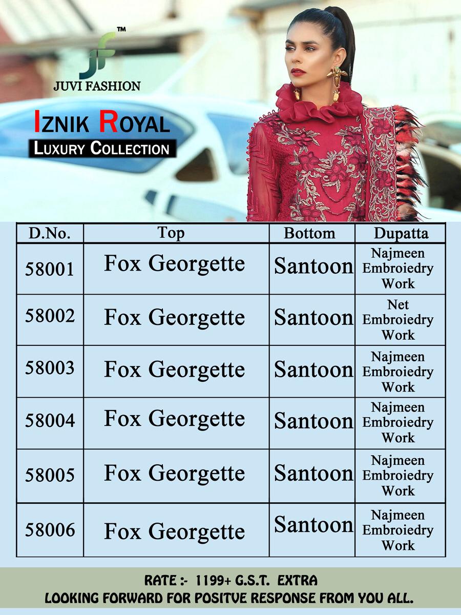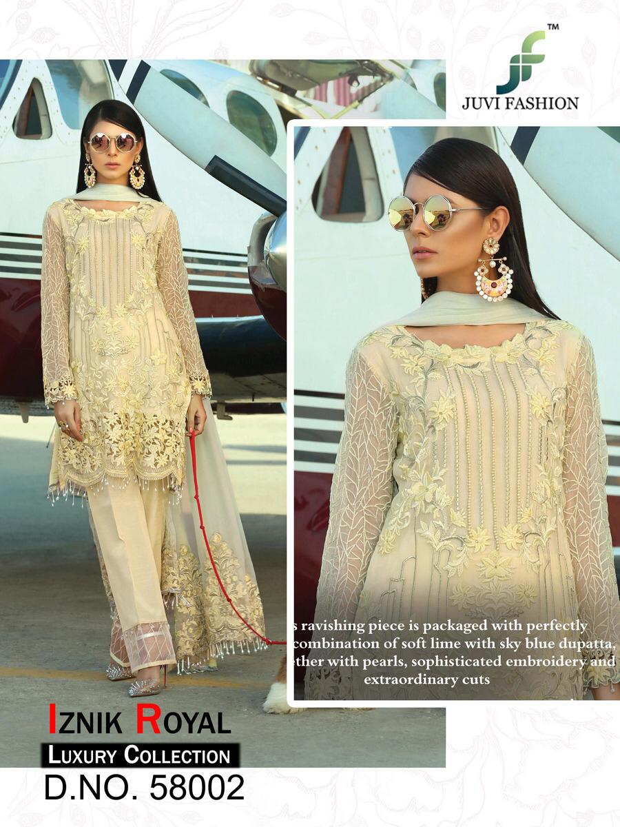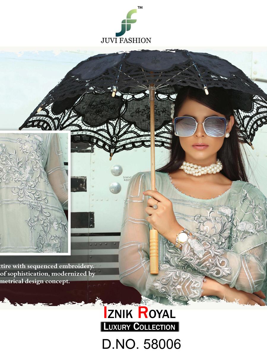 Buy Online Iznik Royal Luxury Collection By Juvi Fashion Series 58001 To 58006 Pakistani Suits Wholesale Supplier Gujarat 6 Pcs of Full Catalogue at Wholesale Price. Looking for Iznik Royal Luxury Collection By Juvi Fashion Series 58001 To 58006 Pakistani Suits Wholesale Supplier Gujarat Full Catalouge at Best Price? Buy Now Iznik Royal Luxury Collection By Juvi Fashion Series 58001 To 58006 Pakistani Suits Wholesale Supplier Gujarat at Wholesale Rate of Rs 7194 with Total 6 Pcs from authroized dealer and supplier of Brand. Cost of Each piece is just only Rs 1199 which is very low and affordable price to resale the product in your retail store ,This is Surat based Wholesale Supplier & Dealer of Brand. Click on Brand name to Know more about Brand's products.Call or Whatsapp on 9898838984 for booking or enquiry