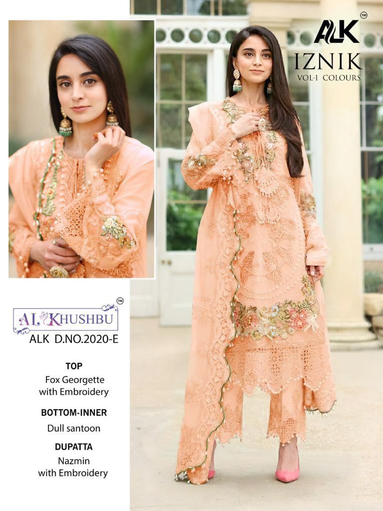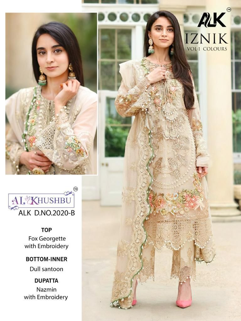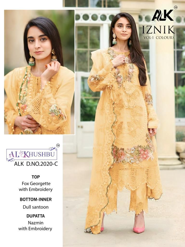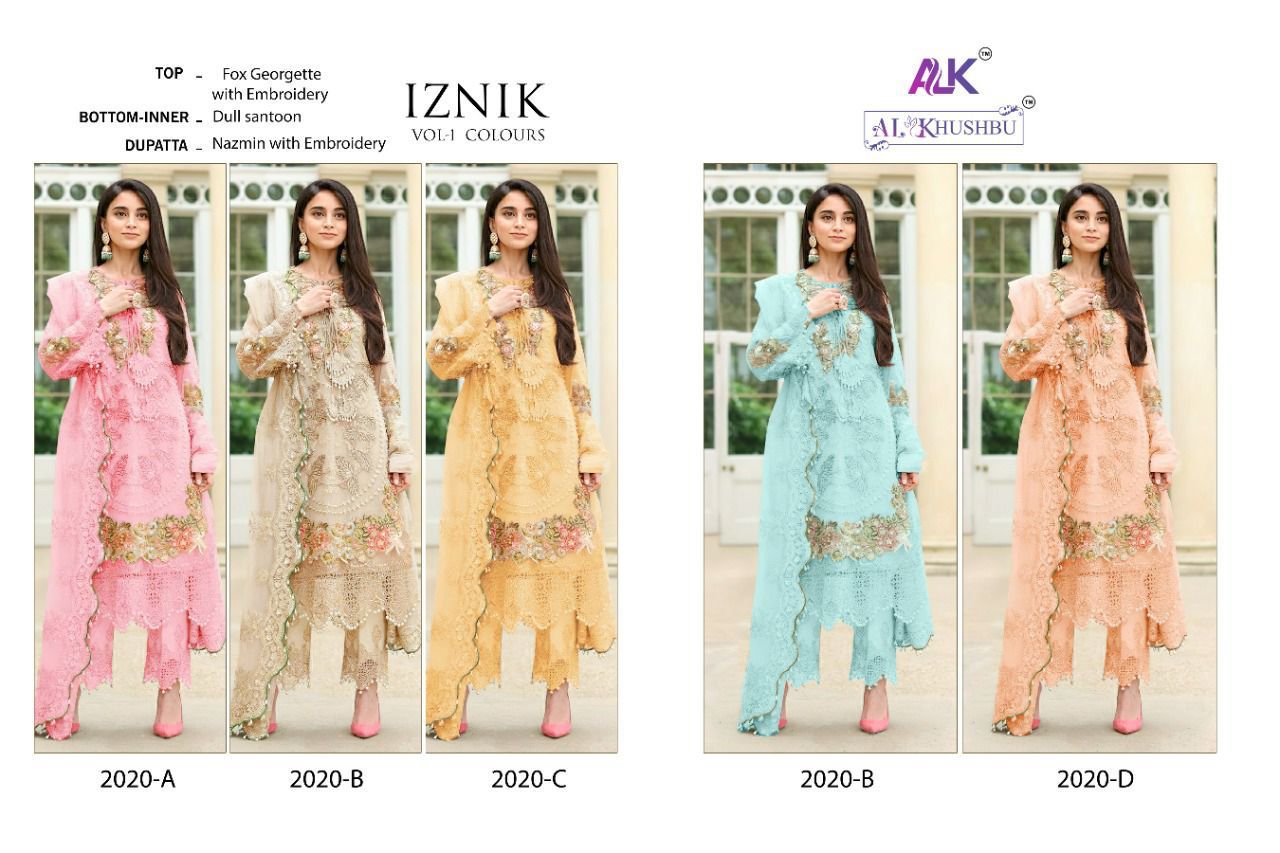 Buy Online Iznik Vol 1 Colours By Al Khushbu Designer Georgette Suit Pakistani Collection Wholesaler Supplier From Surat 5 Pcs of Full Catalogue at Wholesale Price. Looking for Iznik Vol 1 Colours By Al Khushbu Designer Georgette Suit Pakistani Collection Wholesaler Supplier From Surat Full Catalouge at Best Price? Buy Now Iznik Vol 1 Colours By Al Khushbu Designer Georgette Suit Pakistani Collection Wholesaler Supplier From Surat at Wholesale Rate of Rs 5995 with Total 5 Pcs from authroized dealer and supplier of Brand. Cost of Each piece is just only Rs 1199 which is very low and affordable price to resale the product in your retail store ,This is Surat based Wholesale Supplier & Dealer of Brand. Click on Brand name to Know more about Brand's products.Call or Whatsapp on 9898838984 for booking or enquiry