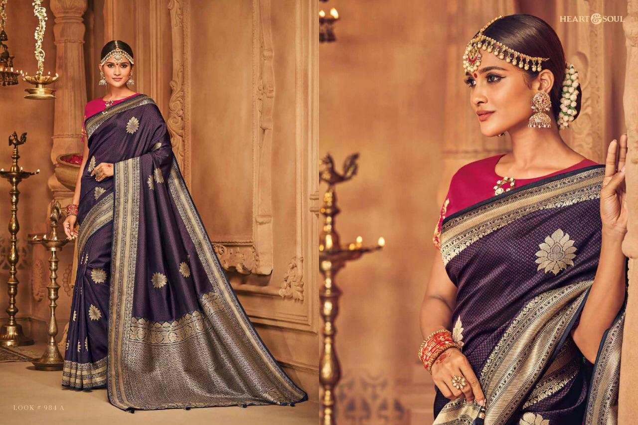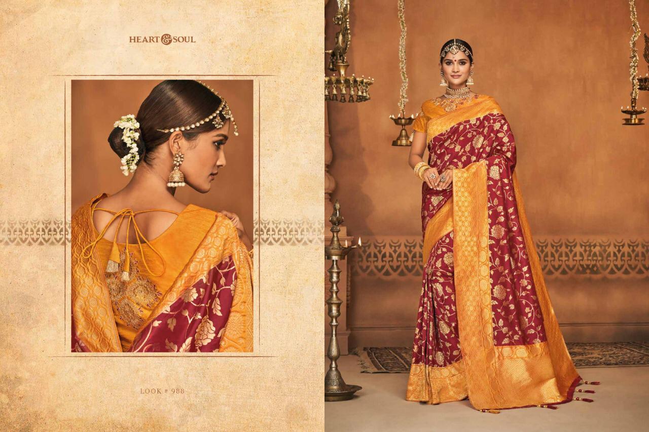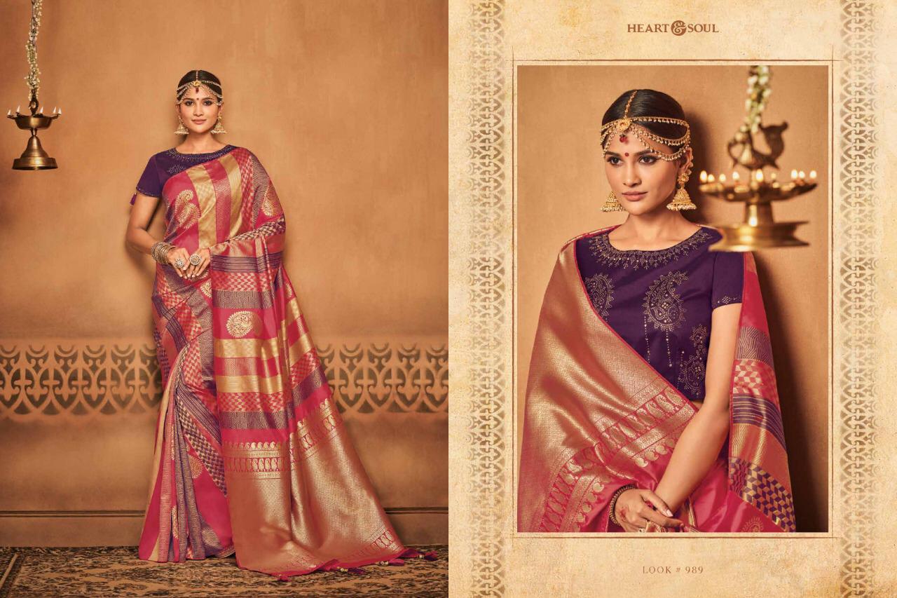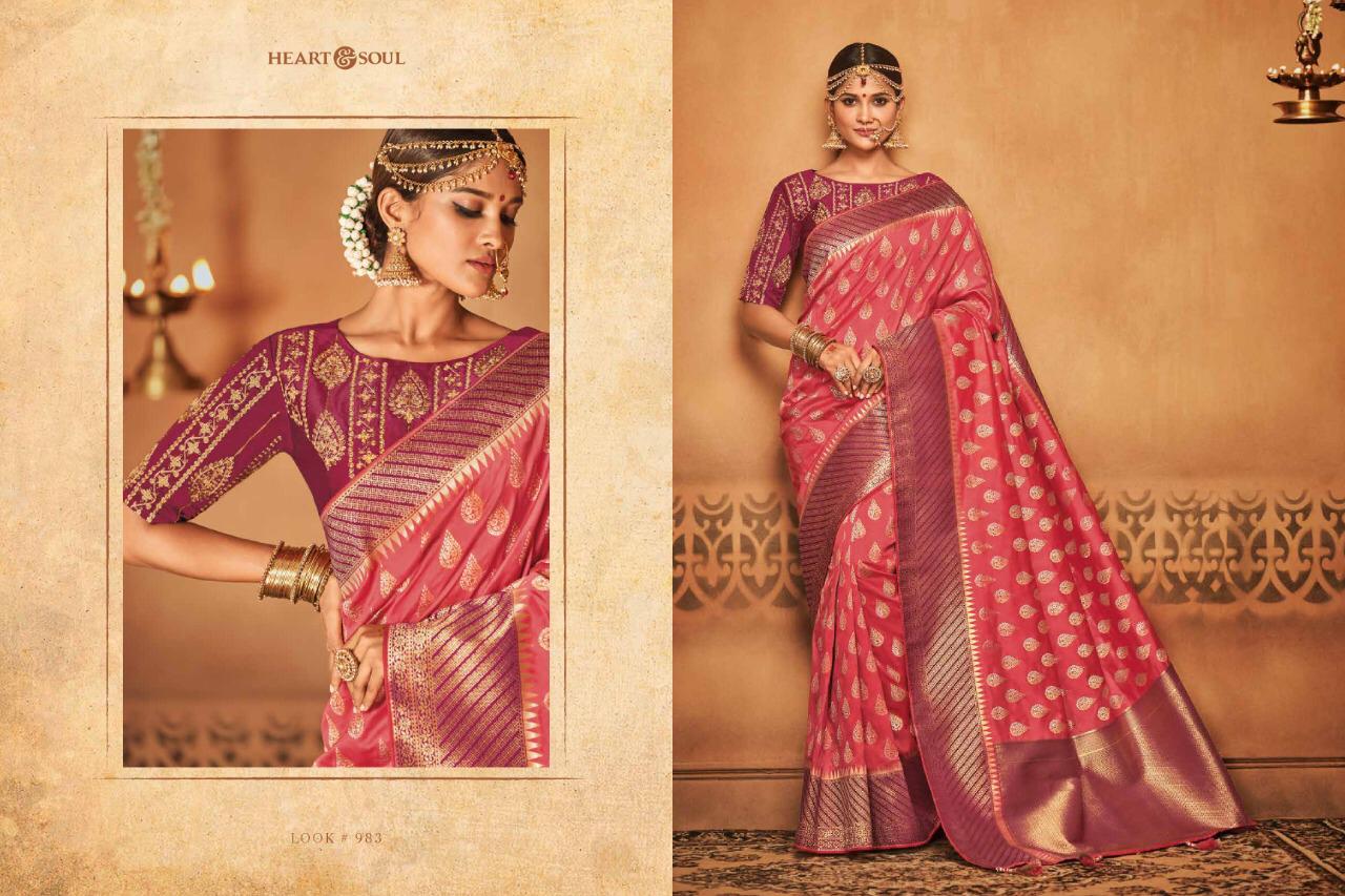 Brand - Heart & Soul Type - saree. Series -982 to 991. * Regular blouse price list separate * ** REGULAR BLOUSE WITH STICH BLOUSE PRICE LIST SEPARATE ** Please note . GST 5 Percent Extra. Delivery 2-3 days . ???. Please note Rate list are separate for Running blouse & * Running with stich blouse * Fabric- P silk JAQURAD. * set & Loose & Singel * |